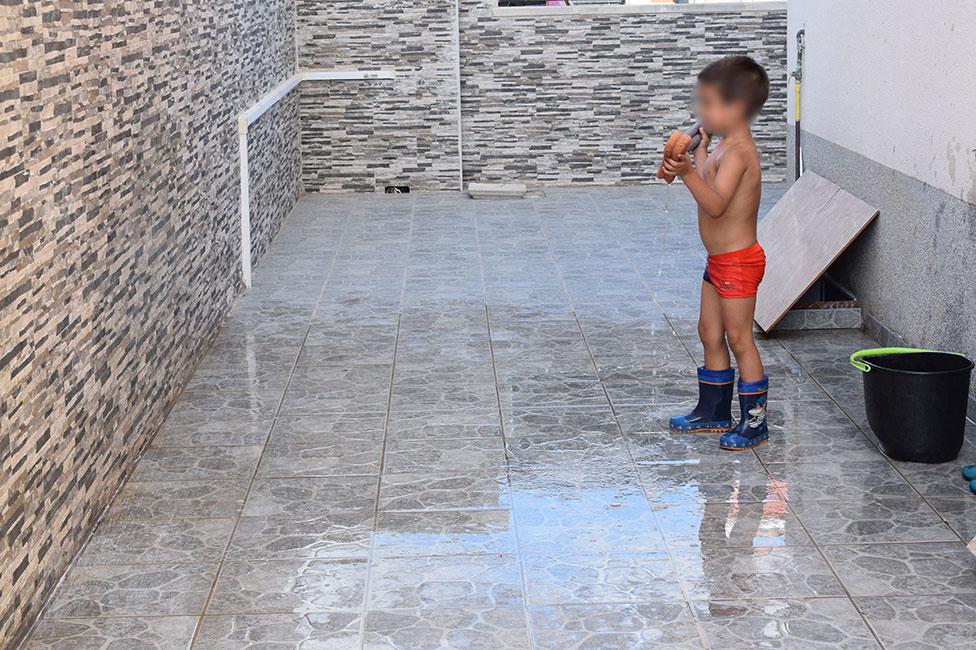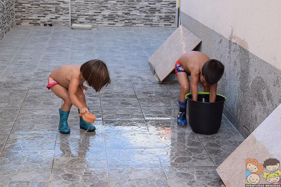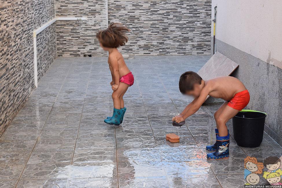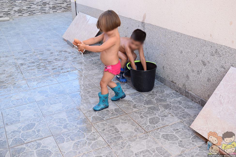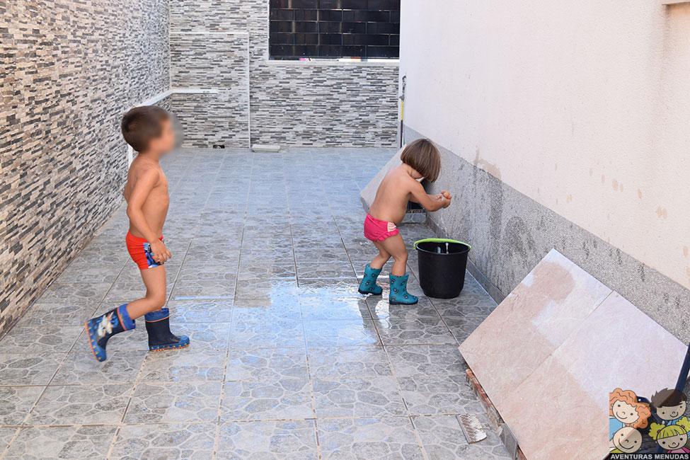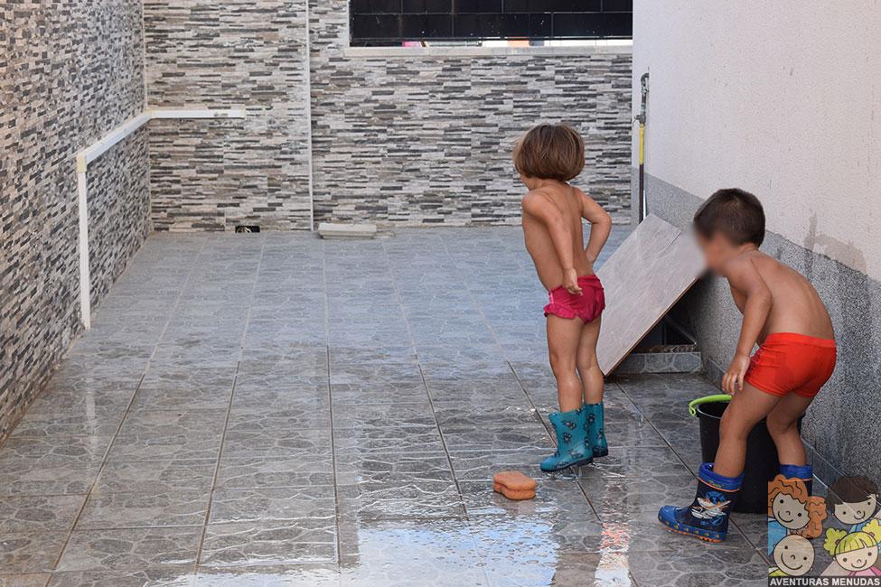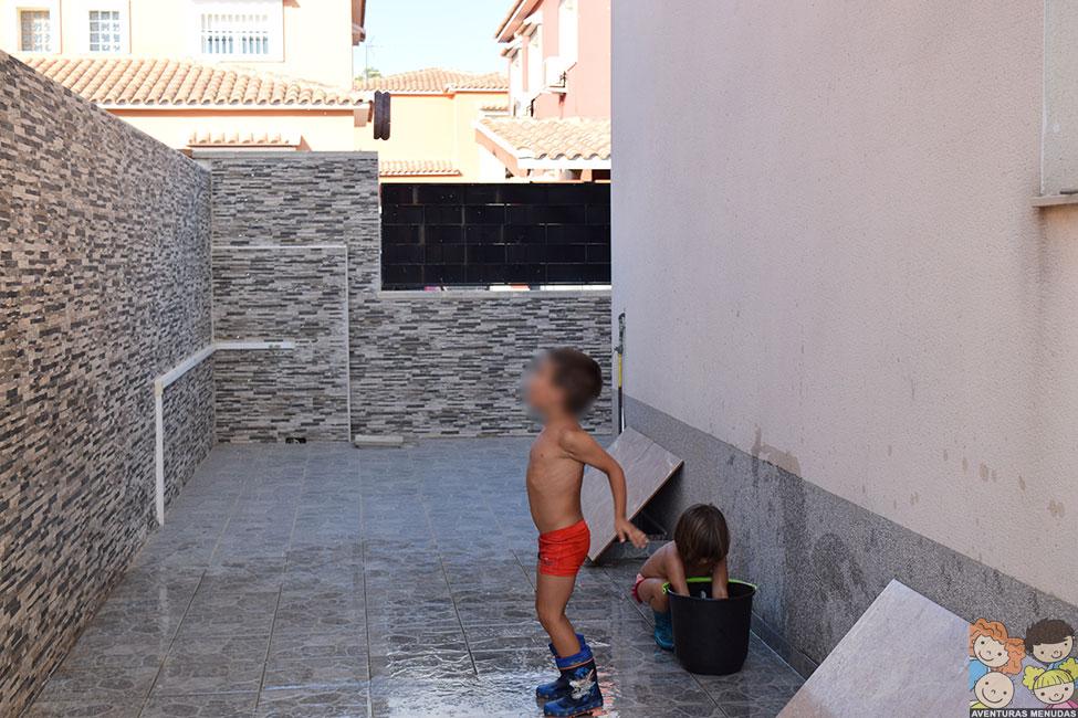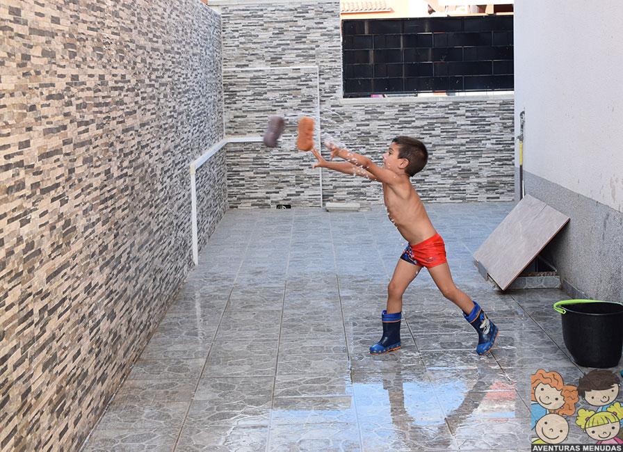Como imaginaréis, después de hacer unas cuantas fotos, allí que me metí yo también. Y no podéis imaginar lo divertido que es. Cuando terminamos de jugar y antes de meternos en la piscina, usamos el agua del suelo, para limpiarlo con un mocho y, además de pasarlo bien, encima nos quedó reluciente… jajajaja.