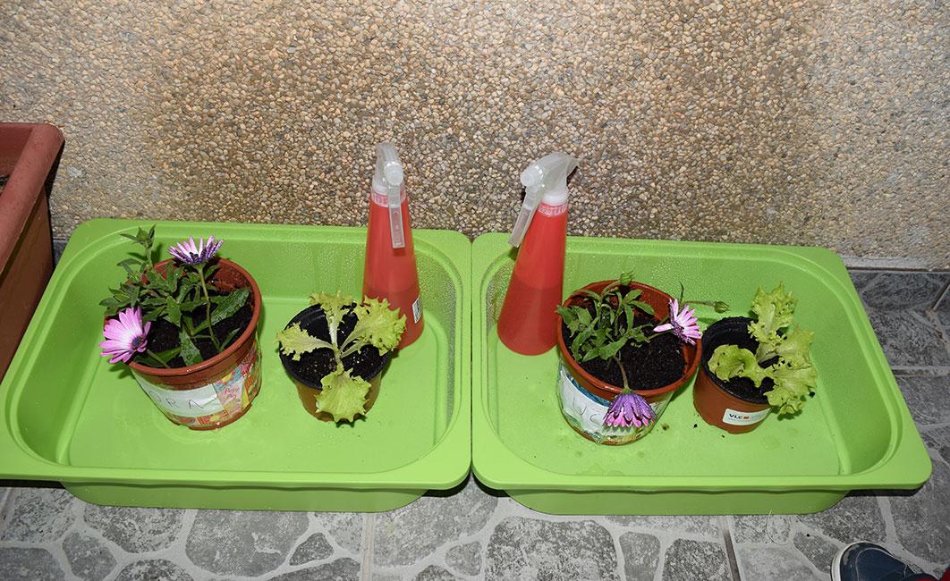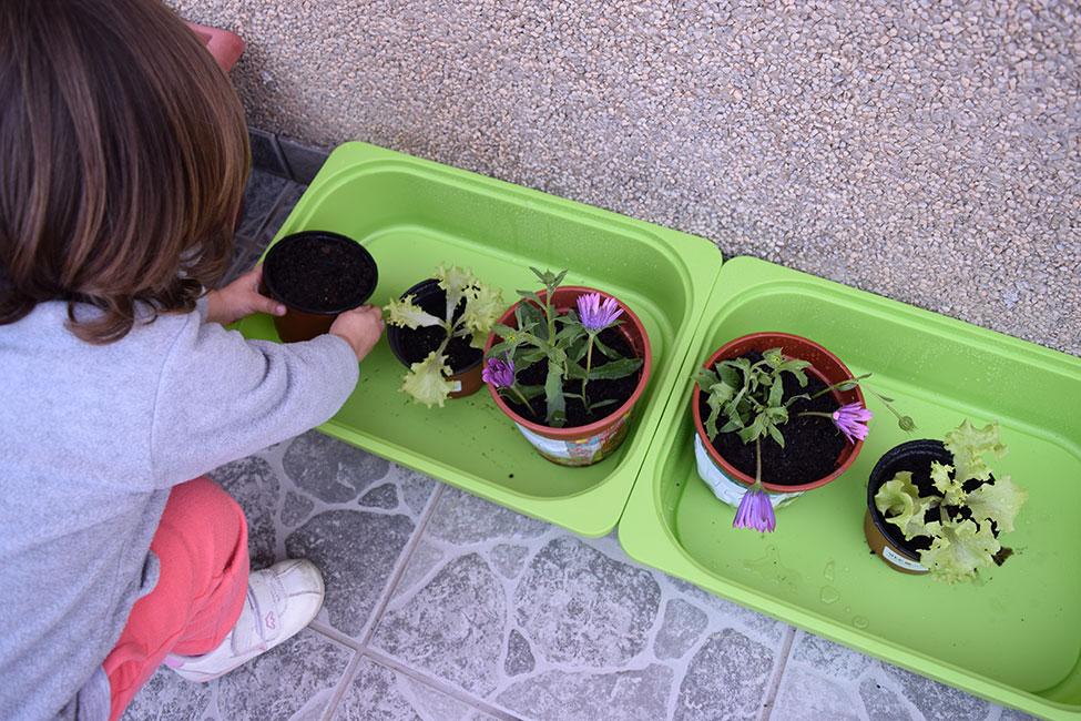 Todo eso me hizo pensar en montar un rinconcito en el exterior sencillo, con sus plantas y su pulverizador para que pudieran ver como crecía su lechuga. Cuando además mi madre les regaló unas margaritas plantadas en una maceta para que las cuidaran… ya la cosa empezaba a tener mucho sentido.