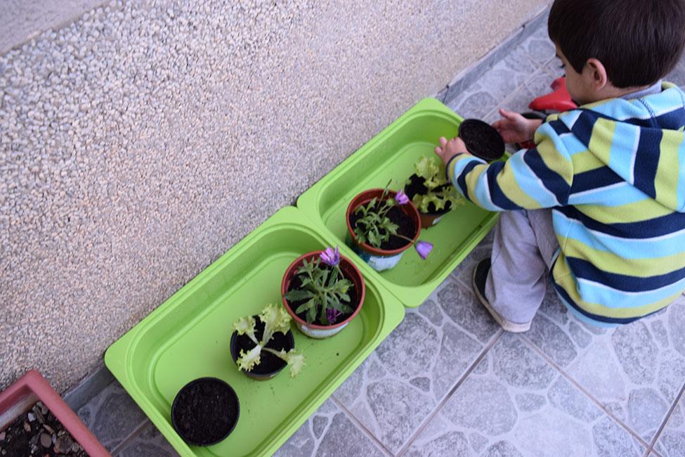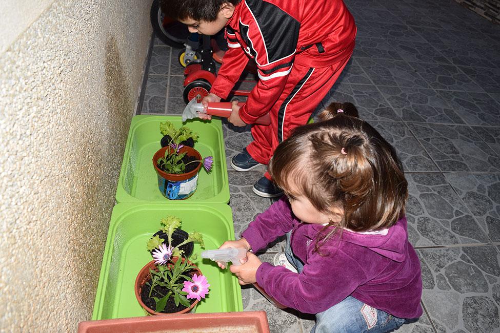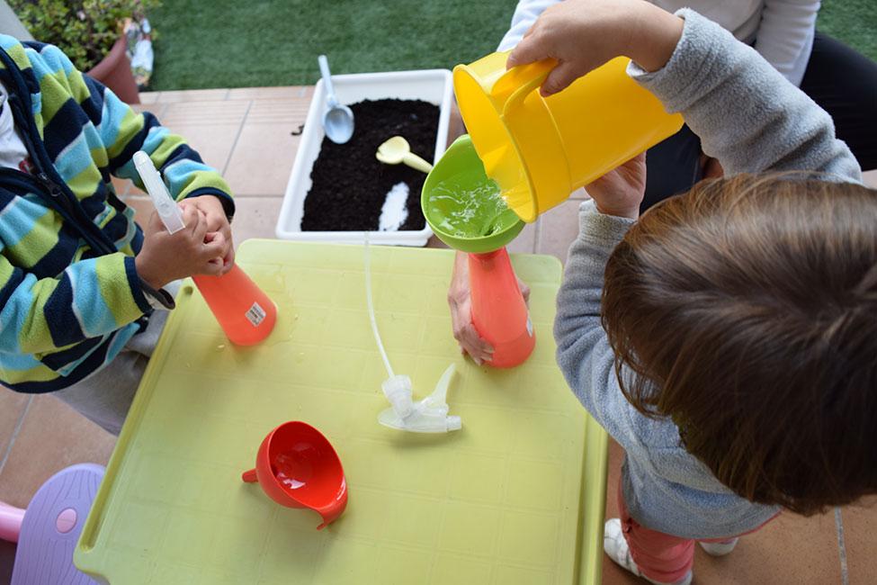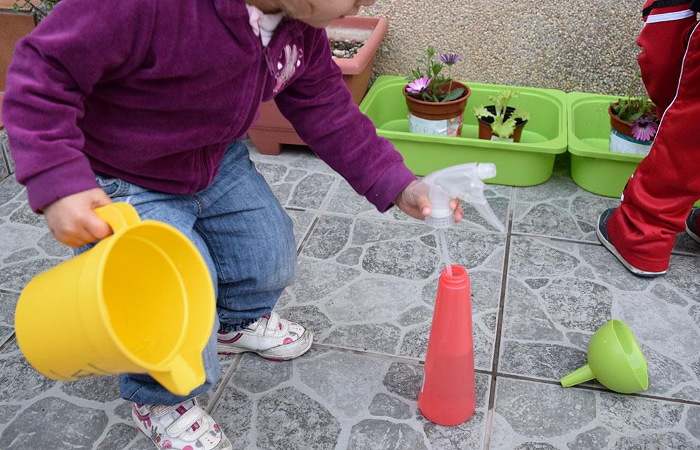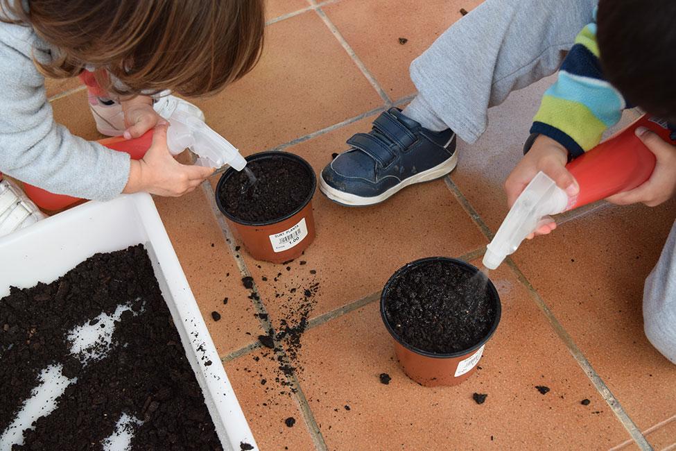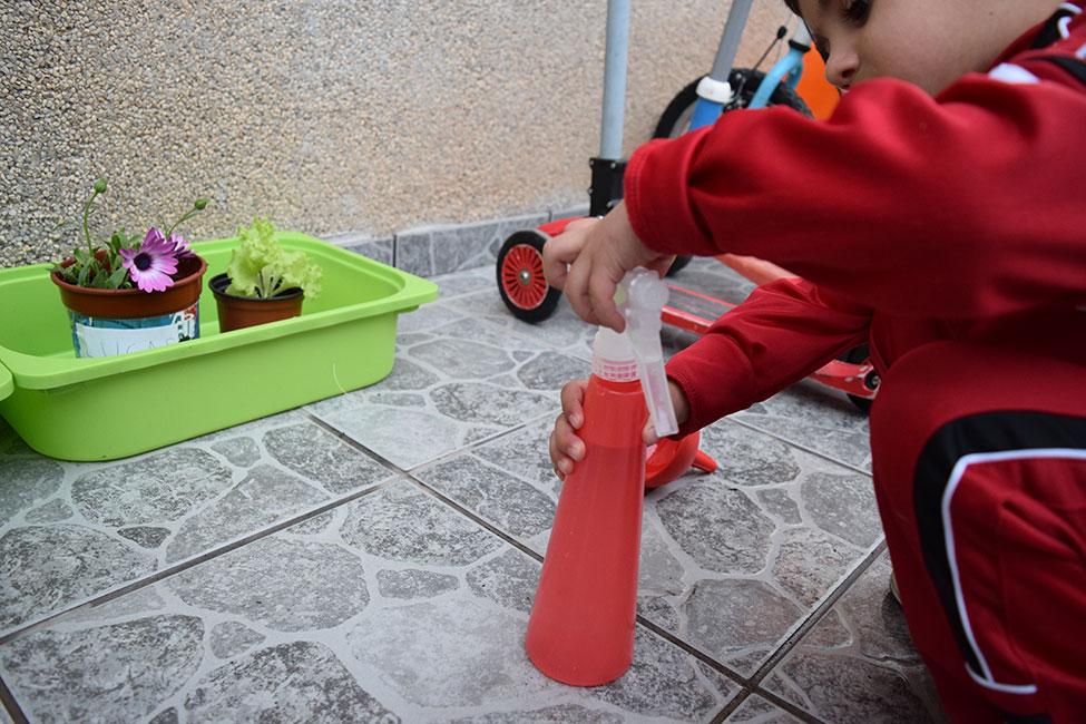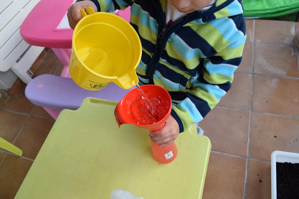 Todos los días tocan con sus deditos la tierra de las macetas y si la ven seca, la riegan con el pulverizador que tienen también en su bandeja “huerto”. Si no le queda agua al pulverizador, pues utilizan el embudo y la jarrita para rellenarla, que además es una actividad súper divertida!!!