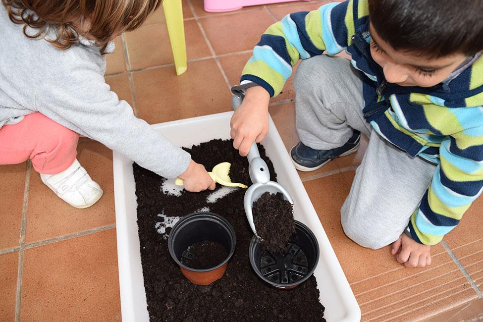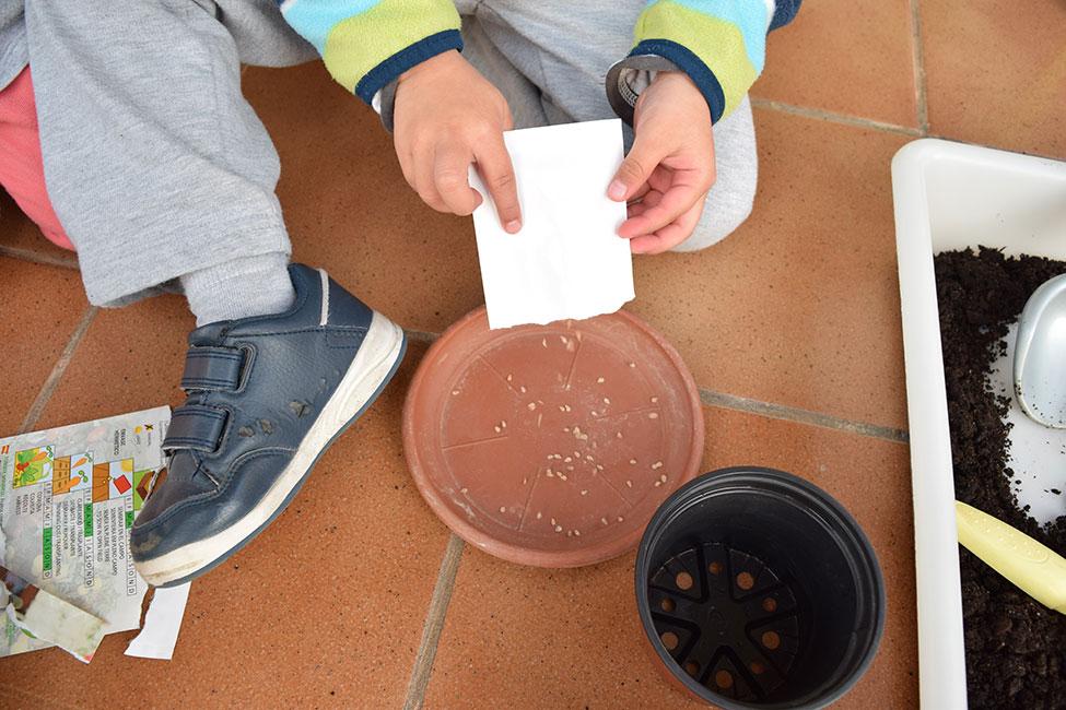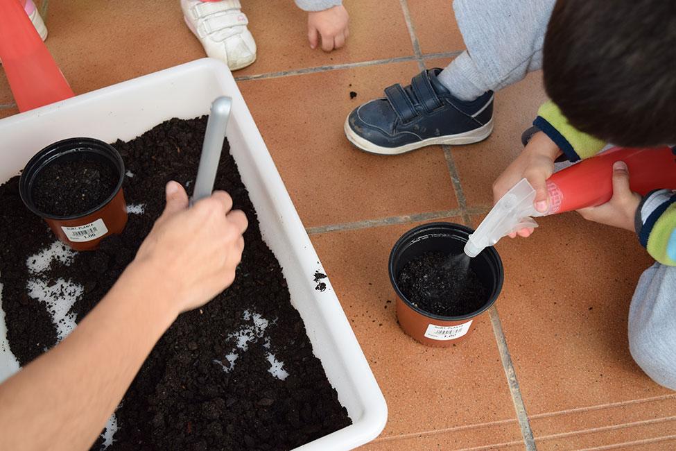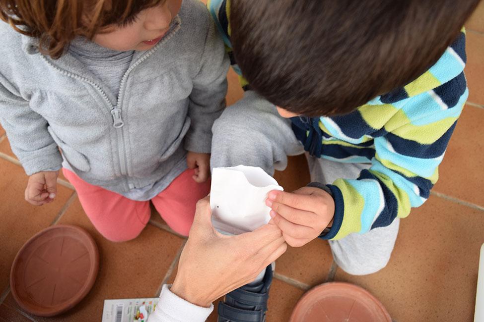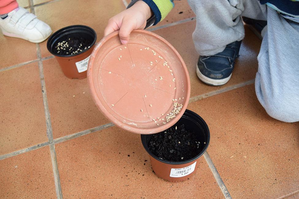 Luego, echaron las semillas de su platito dentro de la maceta, sobre la tierra mojada.
