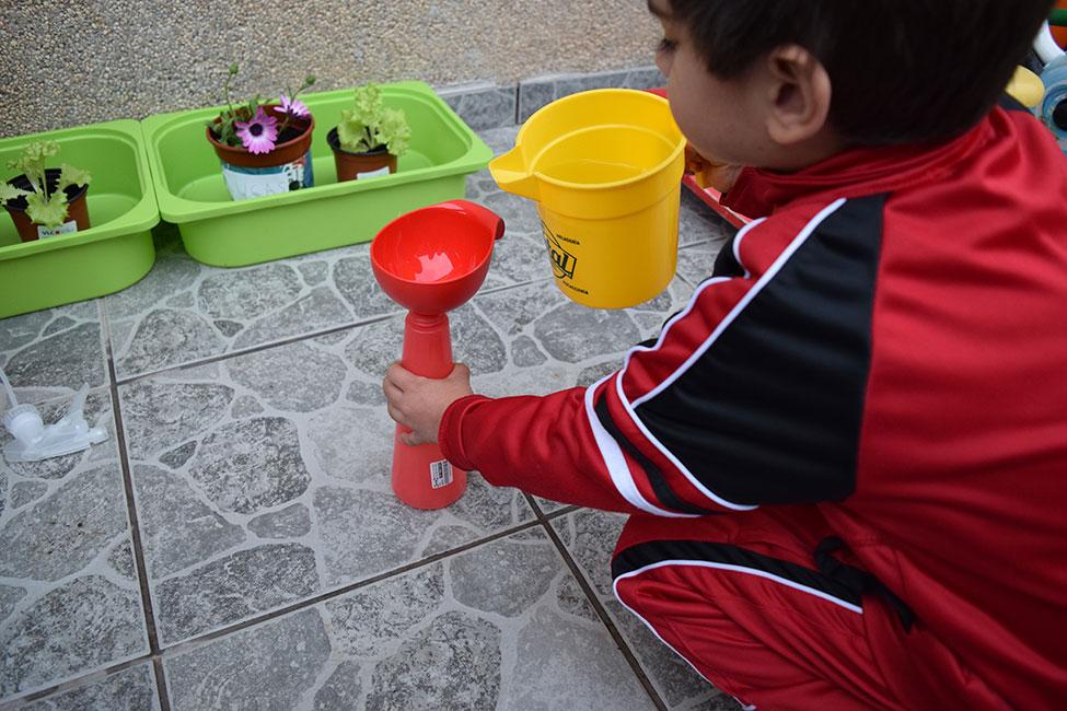 Luego preparon cada uno el agua de sus pulverizadores. Les puse la jarrita de agua y los embudos cerca y ellos mismo hicieron todos los pasos necesarios.