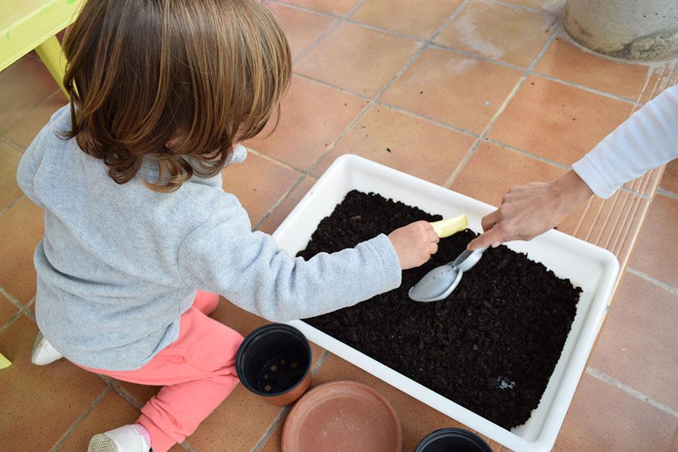 Primero preparar la tierra. Les puse una bandeja toda llena de tierra para macetas. Así que primero la removí para que quedara suelta y pudieran cogerla y ponerla en la maceta sin problemas. Haciéndolo con ayuda, además es mucho más divertido… jejeje.