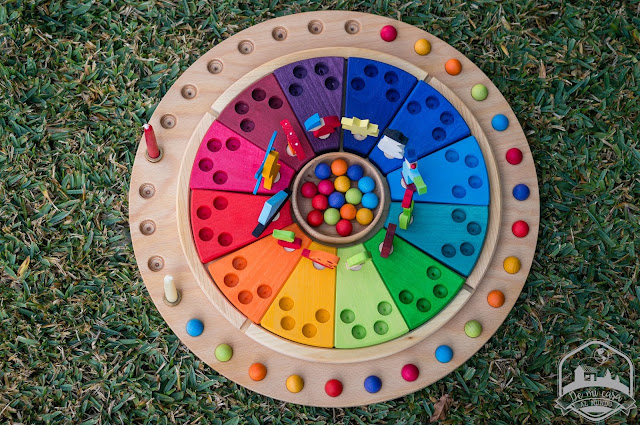 El calendario anual de Grimm’s ha sido sin duda otro de los grandes descubrimientos de este año, que no es tanto un material de juego, sino más bien un elemento para integrar el ritmo anual y el concepto del tiempo, pero me gusta tanto que lo he tenido que incluir en la lista. Además lo utilizamos tooodos los días. Cada mañana Sunflower pone la bolita del día correspondiente.