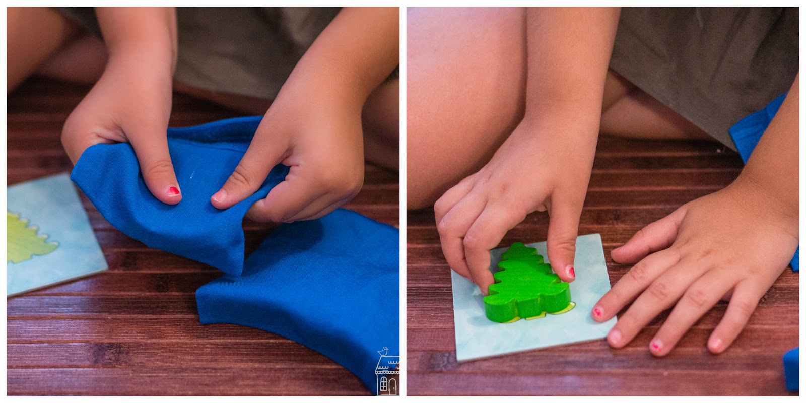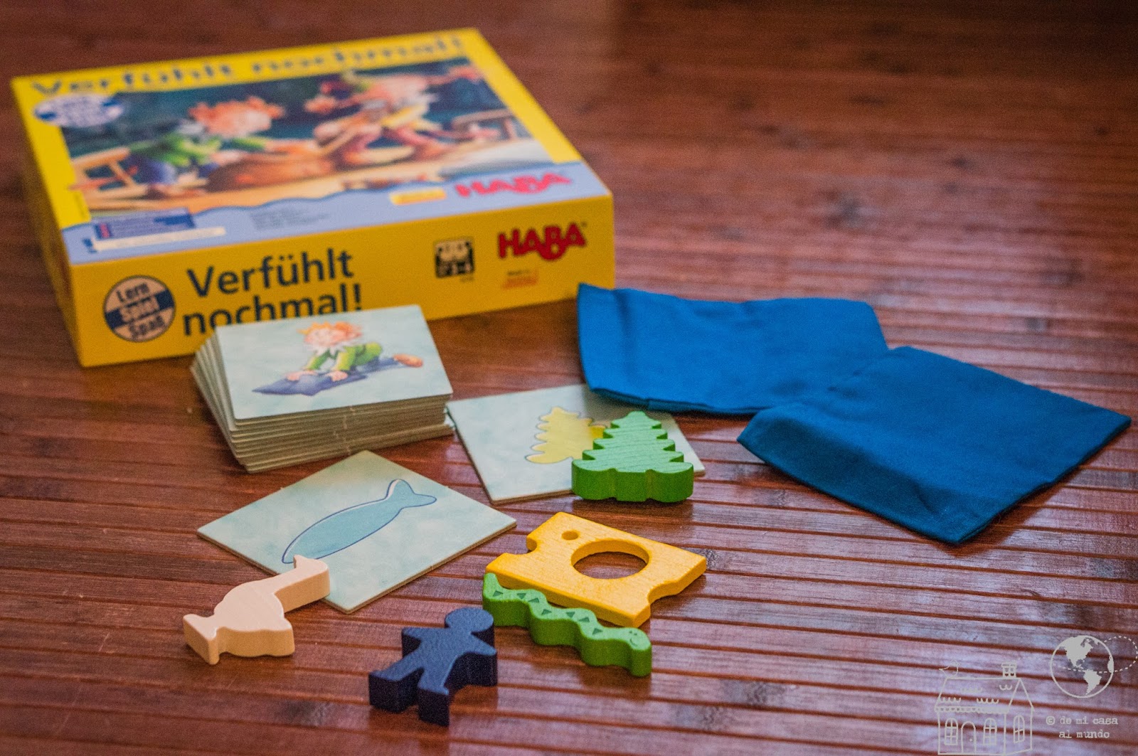 Se llama Tocado, Encontrado. Son 13 objetos de madera que deben esconderse en unas bolsitas de tela. Después escogemos al azar una tarjeta y tocando las bolsitas debemos encontrar el objeto correspondiente.