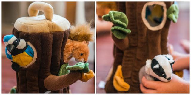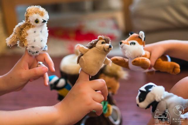 Para acompañar este juego se pueden utilizar títeres de dedo, que son muy fáciles de transportar y muy versátiles. Además de los típicos de Ikea, ahora mismo tenemos un árbol de animales del bosque, que a Sunflower la tiene cautivada.