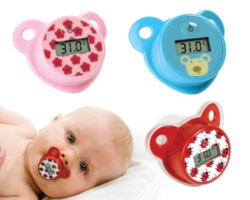 Chupetes con termómetro. ¿No os ha pasado que cuando vais a poner el termómetro a vuestro peque se enfada porque está malito y no quiere que le desnudeis?. En su momento encontré una solución a este problema comprando un termómetro de los que miden la temperatura en el oido, pero me encontré con que la temperatura que me devolvía el aparato no era muy precisa y tardaba bastante. Se lo comenté a la pediatra y me dijo que miden mejor los termómetros de toda la vida. Pues rebuscando un poquito, he encontrado unos chupetes que en la parte exterior del plástico duro llevan un termómetro y al chuparlo el niño, mide la temperatura. Me ha parecido una idea buena, pero cuando se compren hay que mirar si se pueden cambiar las pilas, porque hay modelos en los que la pila llega muy baja de batería y no te permite cambiarla. Por lo demás parece que miden mejor la temperatura que los de oido. Ahí os dejo un enlace para que los mireis.