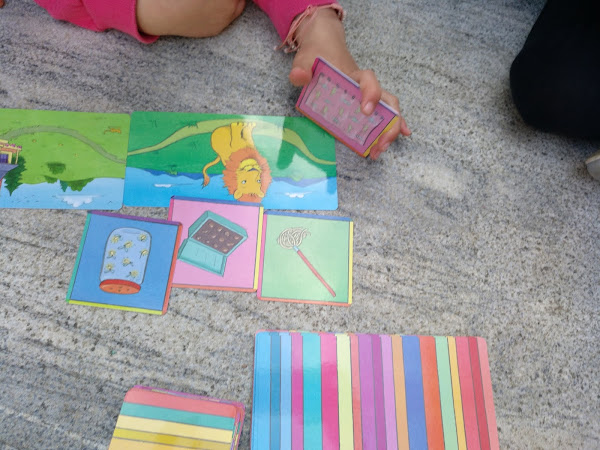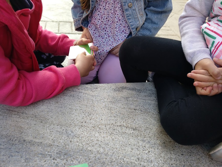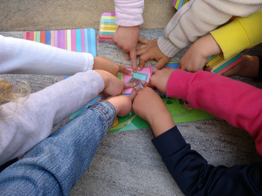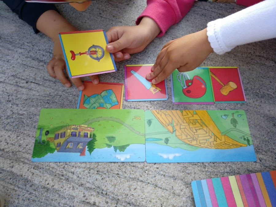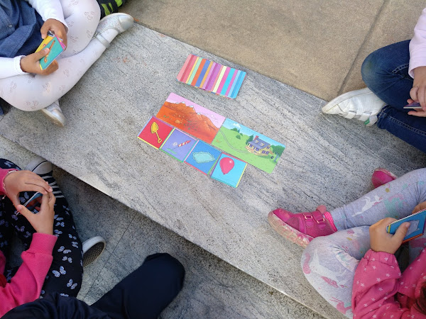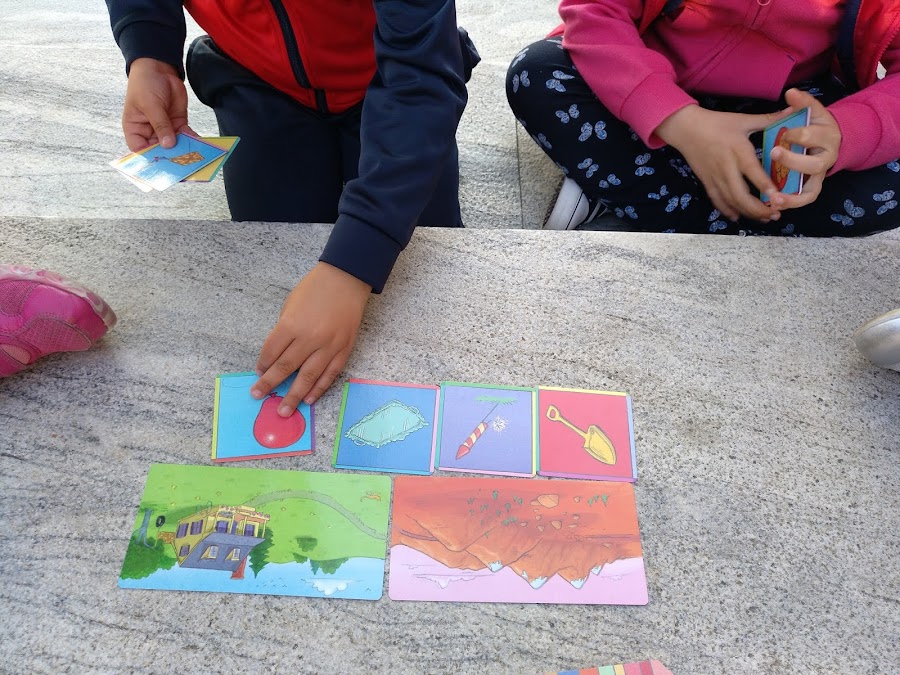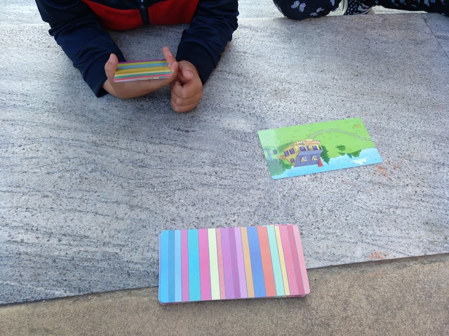 Además, al estar las tarjetas plastificadas podemos jugar sobre cualquier superficie sin que se estropeen. Nosotros también jugamos en el patio al solecito.
