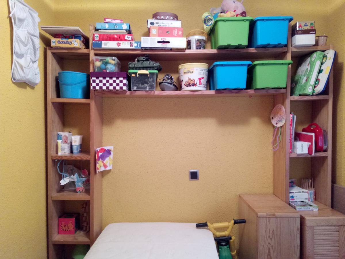 Las mesillas de noche están sacadas de otra habitación y son las “casas” de los legos, que es con diferencia con lo que más juegan. Arriba está lo que tienen que pedir a sus papás y abajo lo que pueden coger ellos.