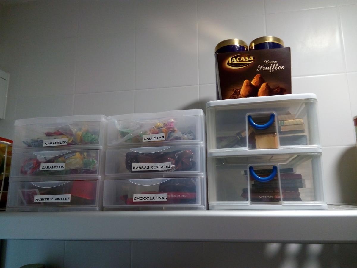Las hay con botes para guardar la pasta, la harina, el azúcar, el café. Y etiquetadas con carteles muy bonitos. Me parecen preciosas, pero según en qué casos, poco prácticas. Porque tienes que estar vaciando y limpiando los botes para que no se quede lo más antiguo en el fondo del bote.
