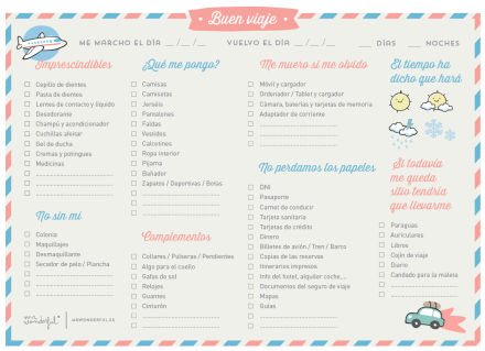 Ha sido una maleta difícil de hacer porque no ha habido lugar para los "por si acaso". Pero el Santo como me conoce, y encima últimamente se me olvida todo, me tenía preparado un organizador de maletas de Mr Wonderful que me ha encantado y me ha sido de mucha utilidad. Espero no llegar al hotel y decir aquello de ¡lo que se me ha olvidado! Si te vas de viaje y quieres tener el tuyo puedes descargártelo aquí.