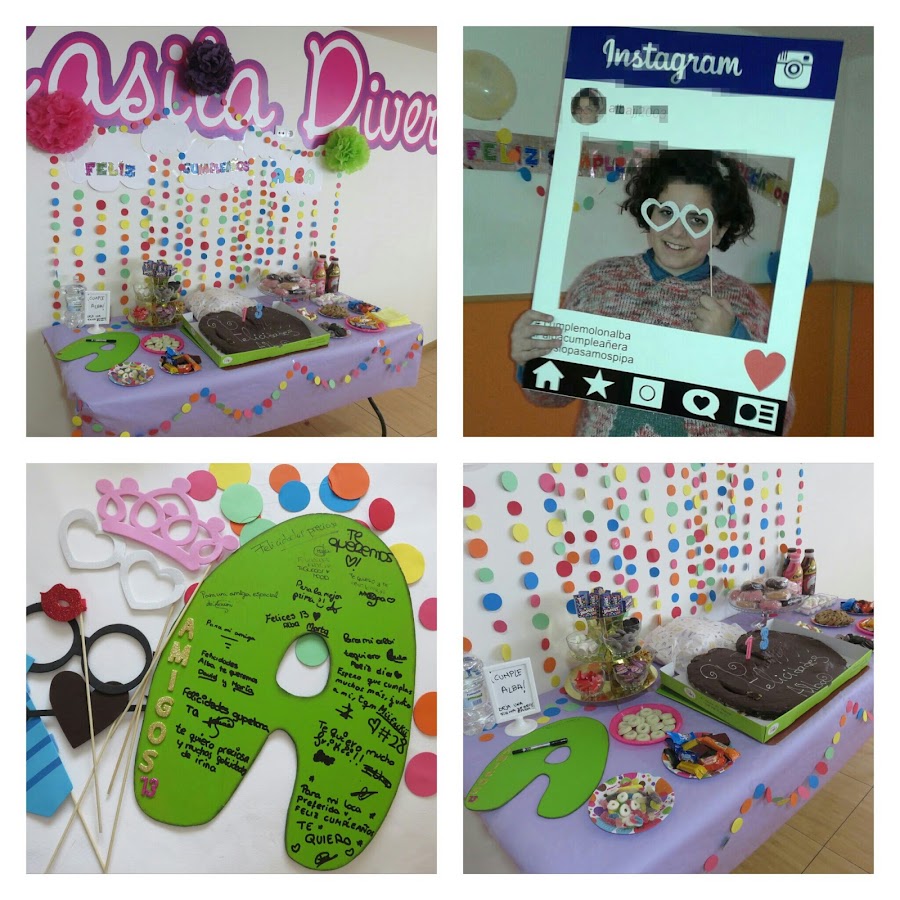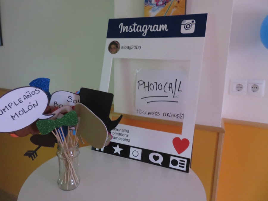 Otra cosa que tenía en mente fue el que quería hacerle un photocall, y viendo lo importante que ya a esa edad comienza a ser las redes, pensé que sería una buena idea hacerle el marco de Instagram. Tal vez esto os suene a chino, pero con una imagen lo veréis más claro.....