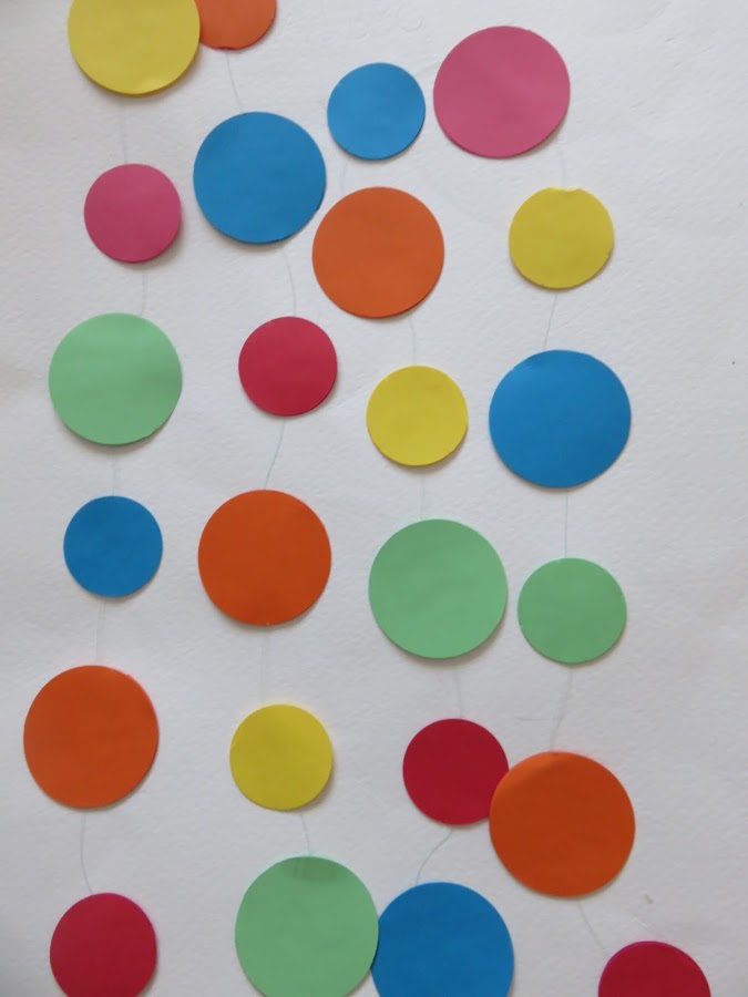 Con cartulina de varios colores, un par de troqueladoras de diferentes tamaños, hilo de pescar y mi pistola de silicona caliente.....trascurridas unas horas ya tenia mi arsenal de círculos listos. Solo me faltaba culminar mi trabajo con unas nubes. Así quedaron.....