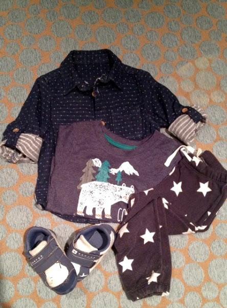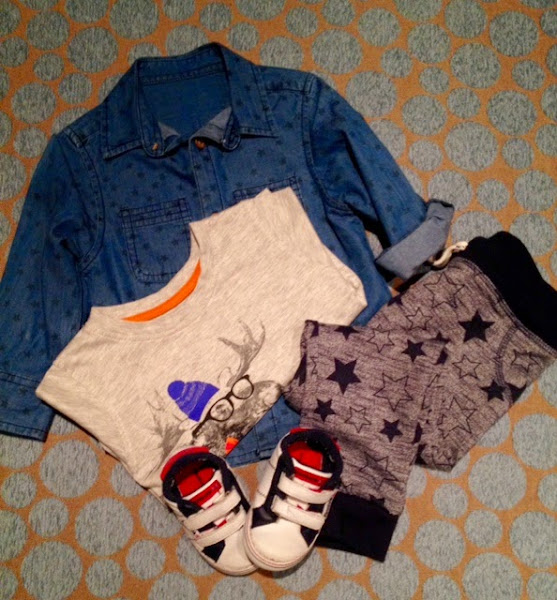 pantalones de estrellas, camiseta oso polar, camisa de topitos - Primark y H&M