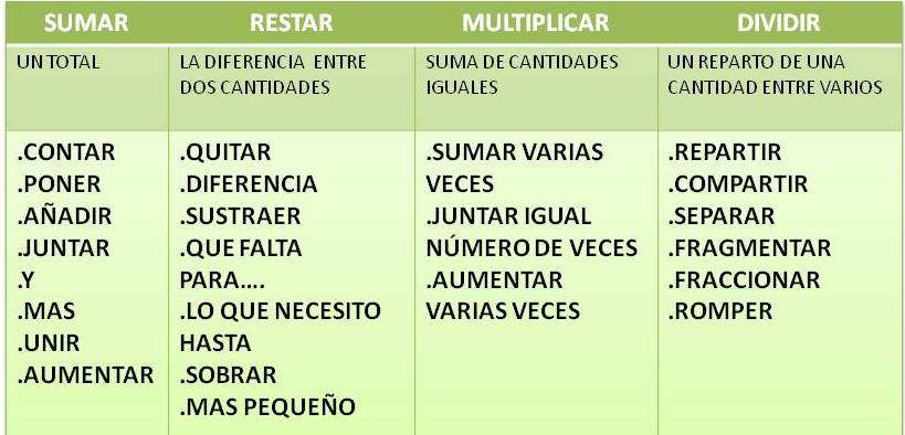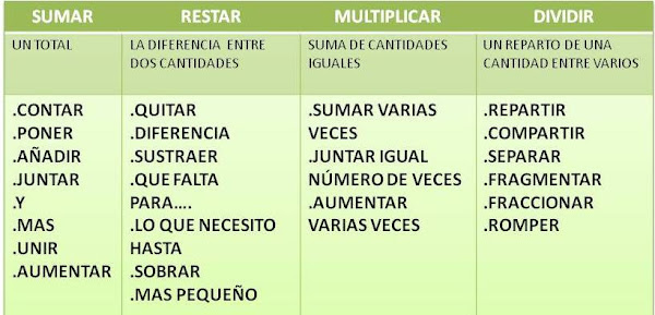 Leyre va a clases de repaso y se lo comenté al profesor y éste me dijo que hay un relación de palabras que ya te indican que operación has de realizar, así que me puse manos a la obra y he encontrado unas cuantas que os voy a dejar a continuación.