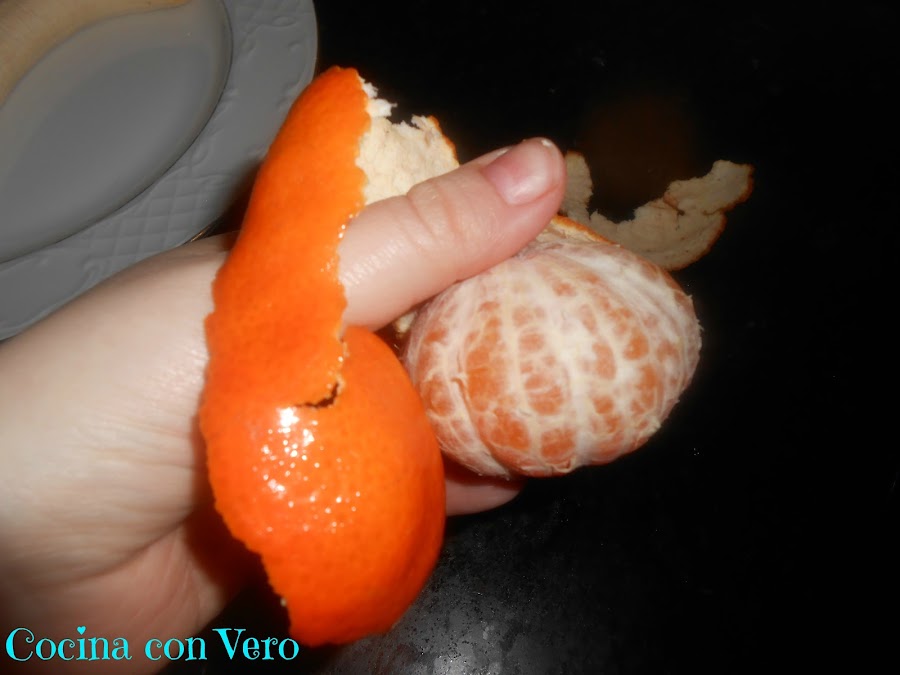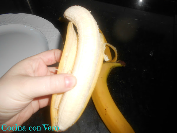 1/ Quitamos la cáscara del plátano y lo vamos cortando en rodajas (ruedas).