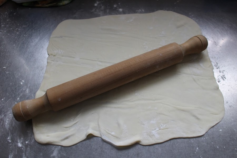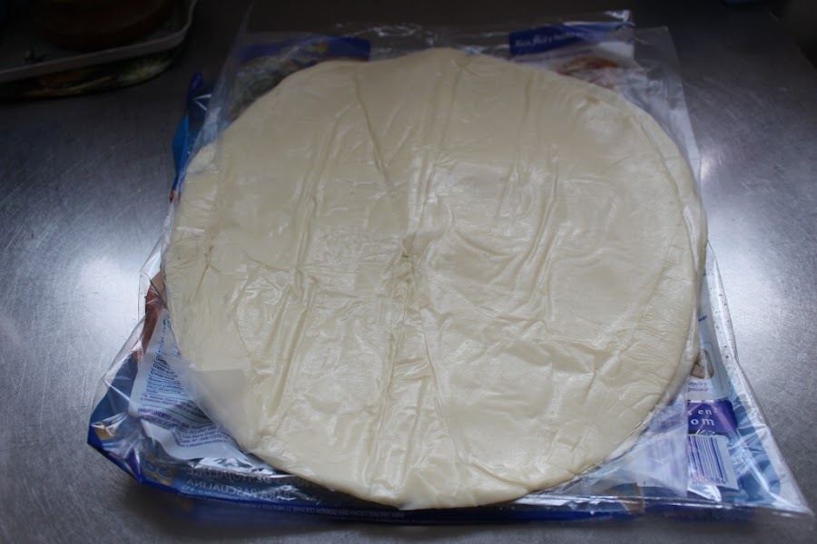 Separar las tapas y sobre una mesada enharinada y estirar un poco. Si se hacen algunos agujeritos no pasa nada porque después la vamos a enrollar.