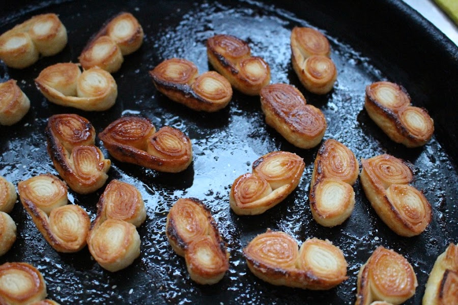 Cortar las palmeritas del ancho de un dedo aproximadamente, y disponerlas sobre una placa enmantecada. Pincelar con yema de huevo y espolvorear con azúcar.