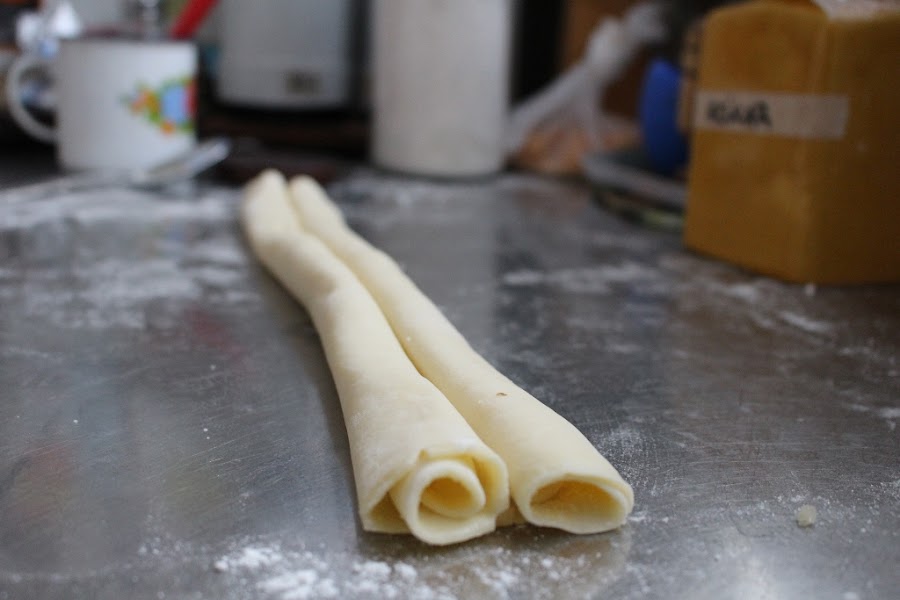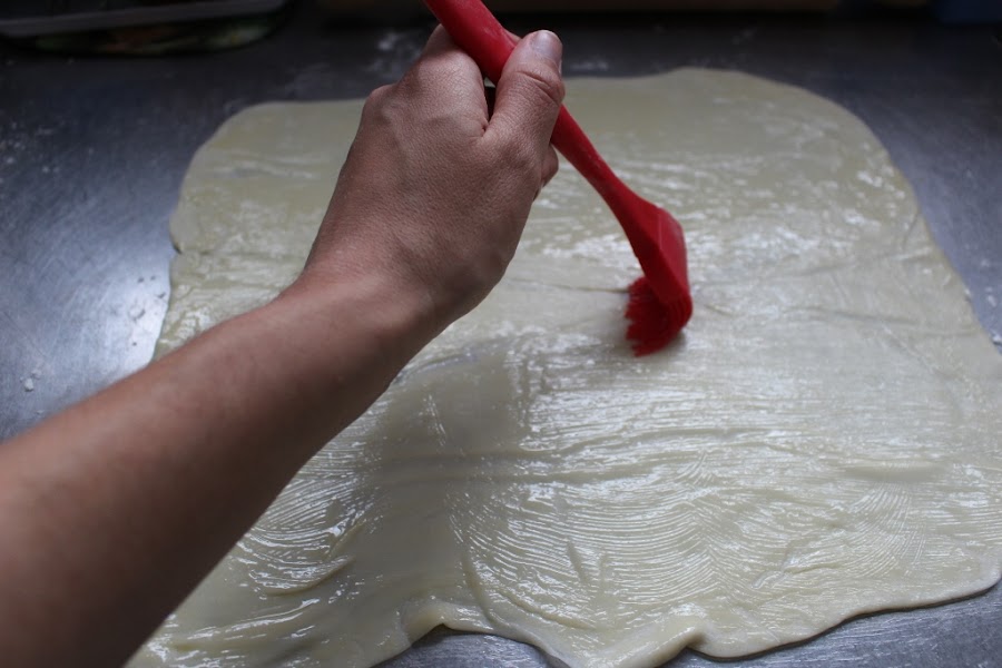 Enrollar la masa hacia adentro hasta llegar a la mitad, y luego enrollar la otra mitad. Pincelar con la manteca derretida y espolvorear con azúcar nuevamente.