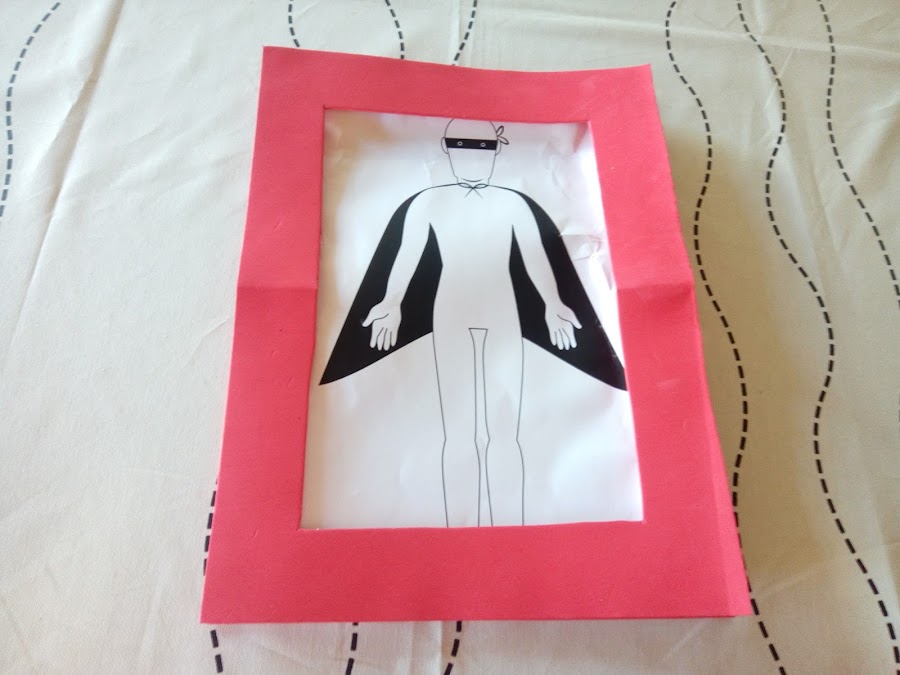 Puedes calcular como va a quedar poniendo la lámina a colorear del superhéroe sobre al base de goma eva y colocar el marco antes de pegar para ver si se ve bien el dibujo o tapa mucho.