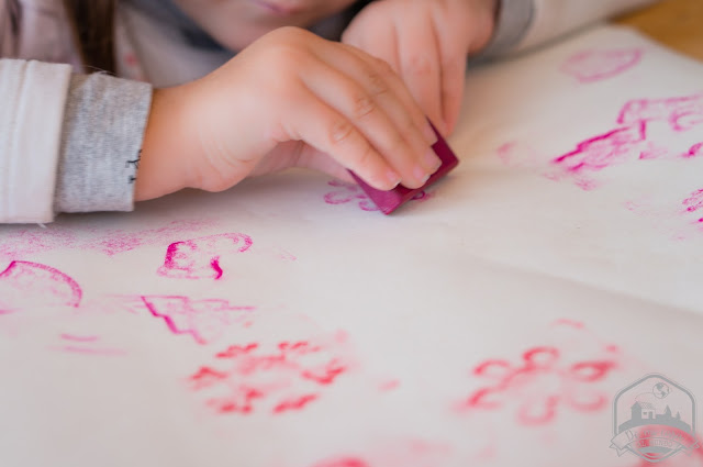 Una opción sencilla pero resultona consiste en colocar las plantillas debajo del papel y con cuidado pasar con los bloques de cera por encima. Se queda marcada la figura que hay debajo y cuando hay diversos motivos, queda muy bonito.