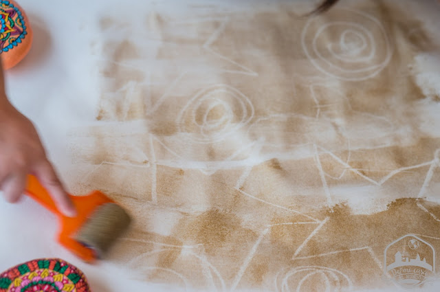 Después pintamos con un poco de pintura dorada algo aguada sobre los dibujos que acabamos de hacer, y ¡tachán! Irán apareciendo las formas.