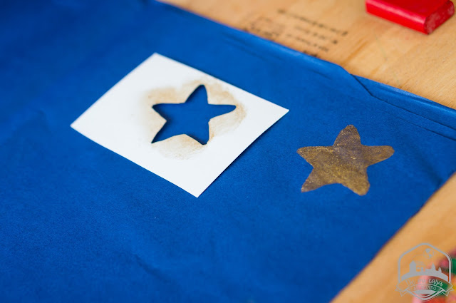 Con la plantilla de una estrella que habremos recortado en un cartón, la vamos colocando sobre un papel de seda (el papel pinocho también sería adecuado) y con la esponja ligeramente bañada en pintura dorada, la vamos poniendo sobre la plantilla.