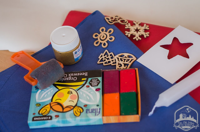 Plantillas de cartón (hicimos una plantilla de una estrella y también utilizamos unas figuritas de madera que tenía por mi taller, pero si no tienes, lo suyo sería recortar algunas formas de cartón: estrella, corazón, arbolito,…)