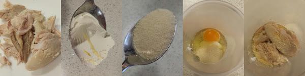 2. Poner en un recipiente donde podáis batir, el huevo, el queso, el pan rallado, el pollo ya cocinado, un poco de sal, una pizca de ajo molido y batirlo todo.