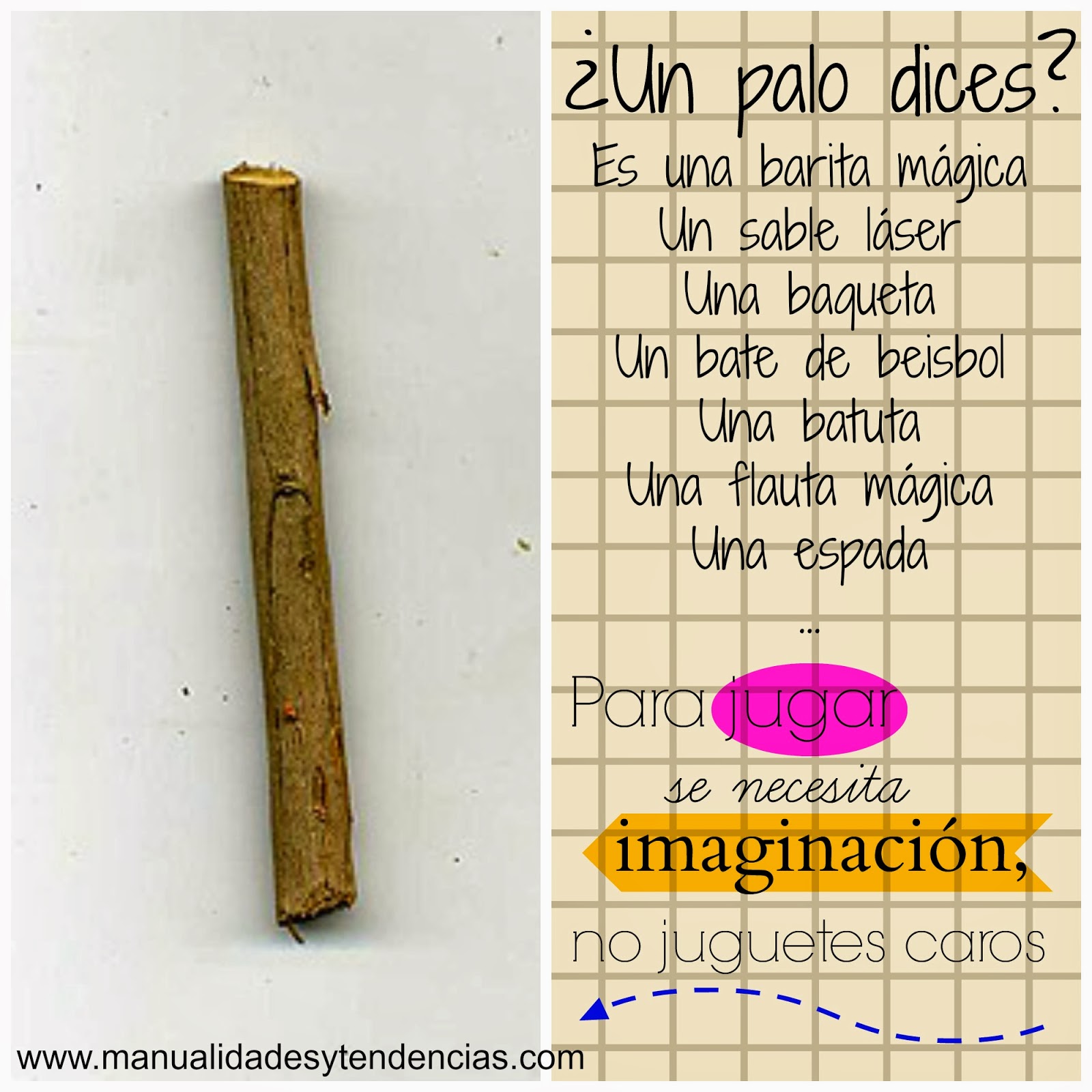 ¡Buenos días! Me gustó mucho la campaña publicitaria de Limón y nada, ya sabéis cual digo, la del palo. Así que quiero aportar mi granito de arena a esta idea de volver a los juguetes simples que estimulan la imaginación de los niños.