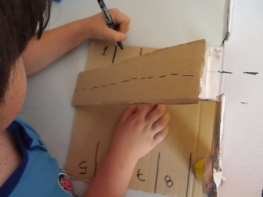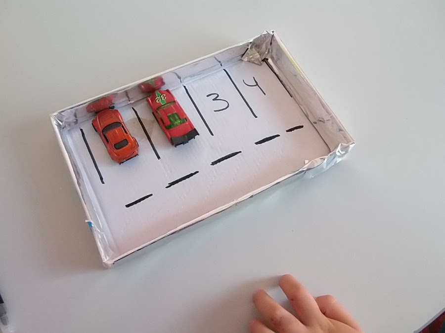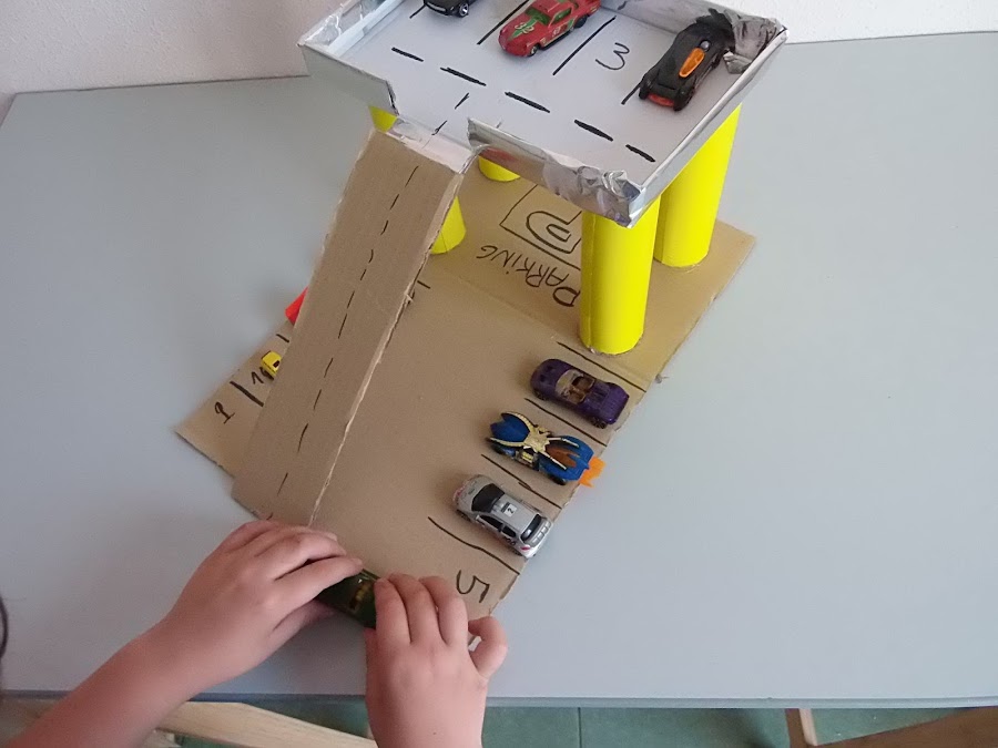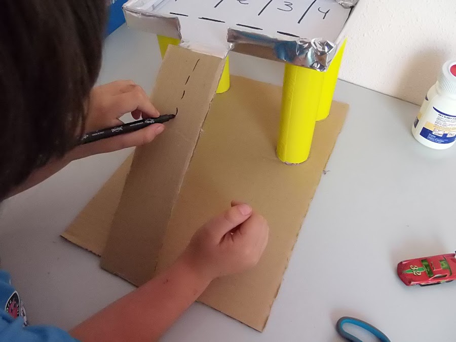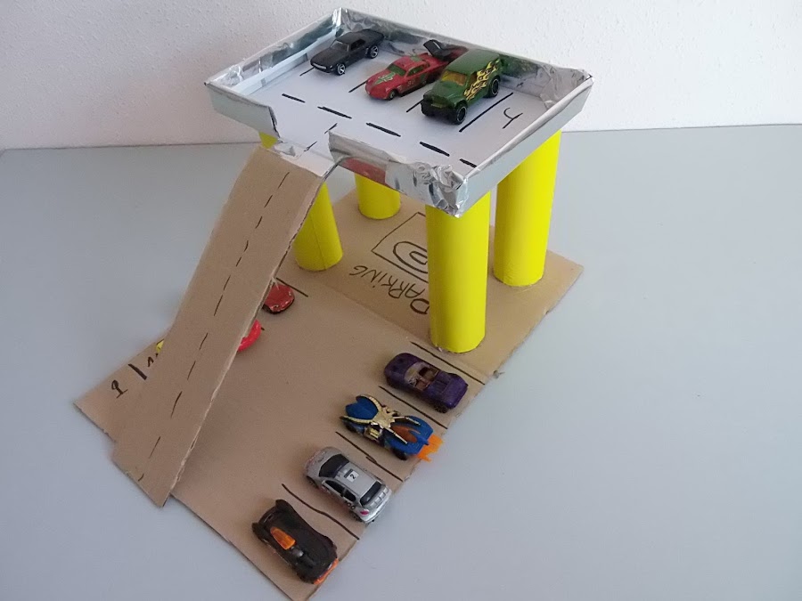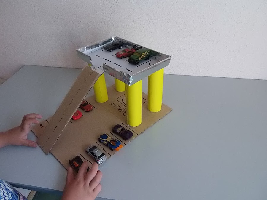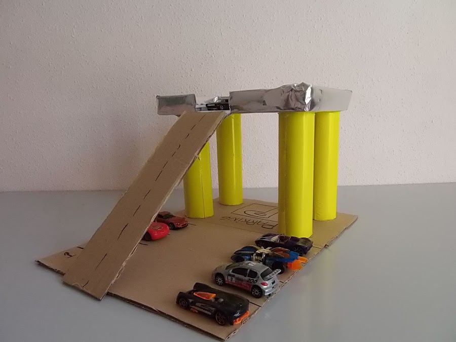 5.Ahora colocamos con un trozo de cartón la rampa por donde subirán los coches y decoramos! Y ya tenemos un parking :D