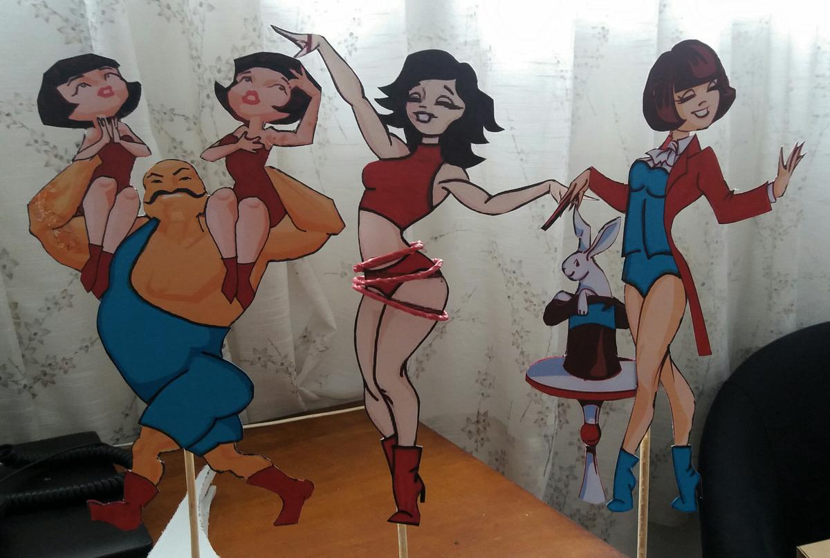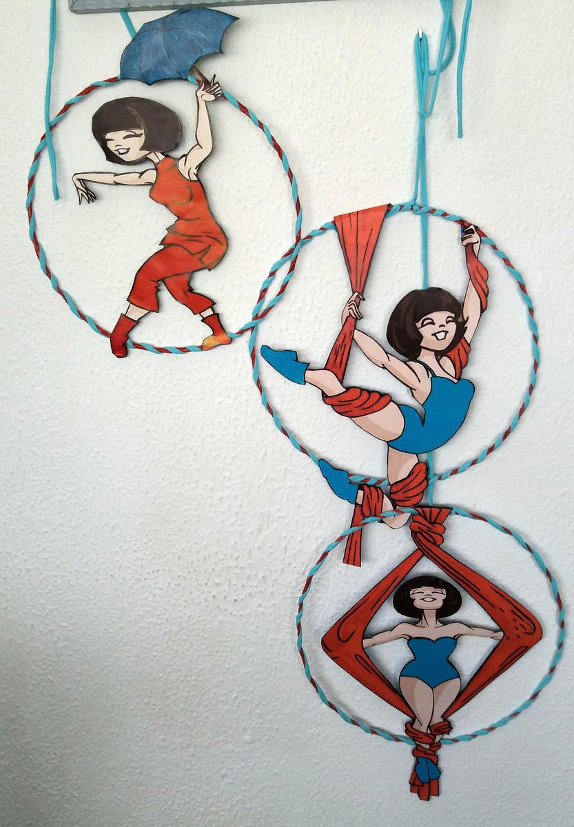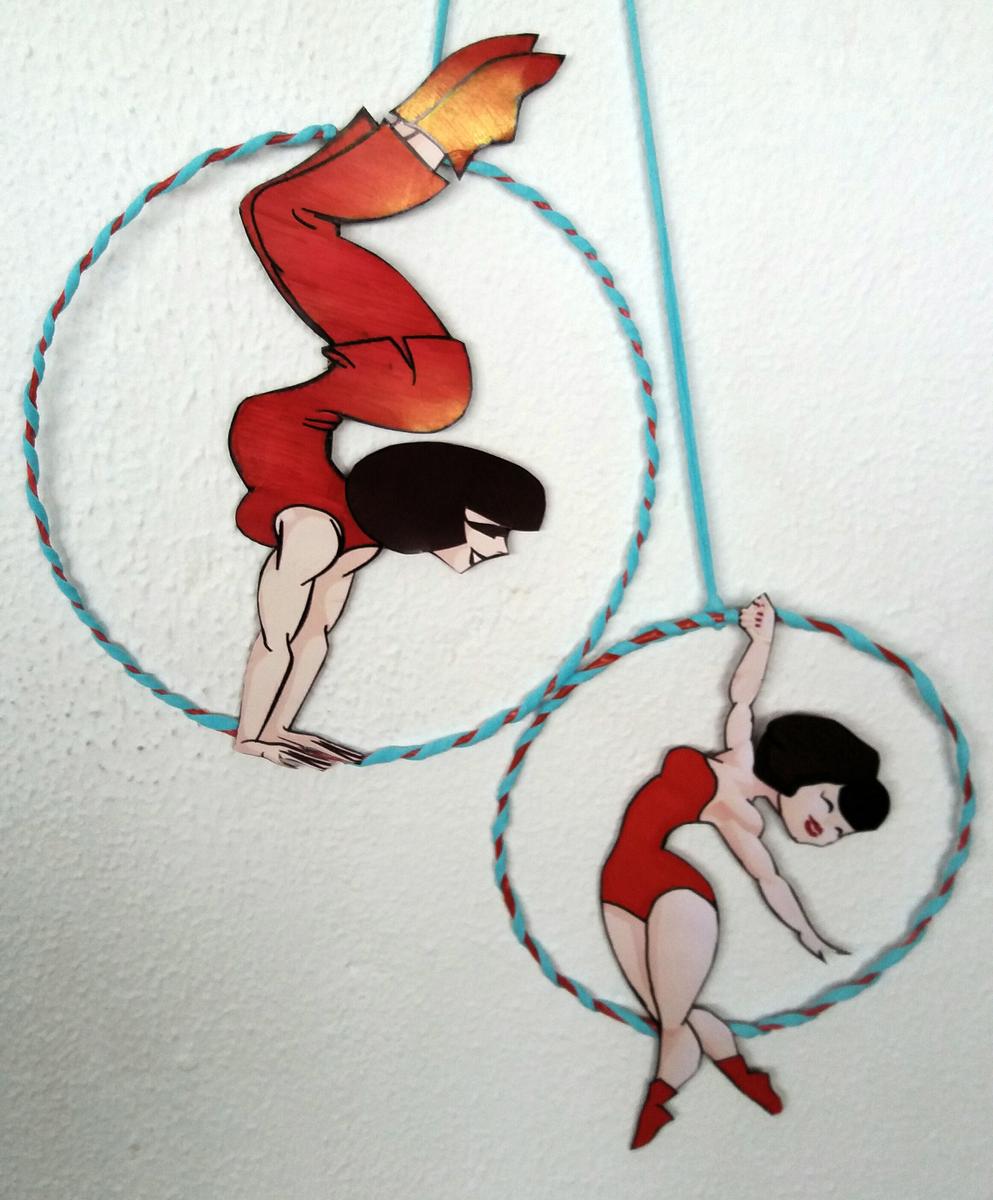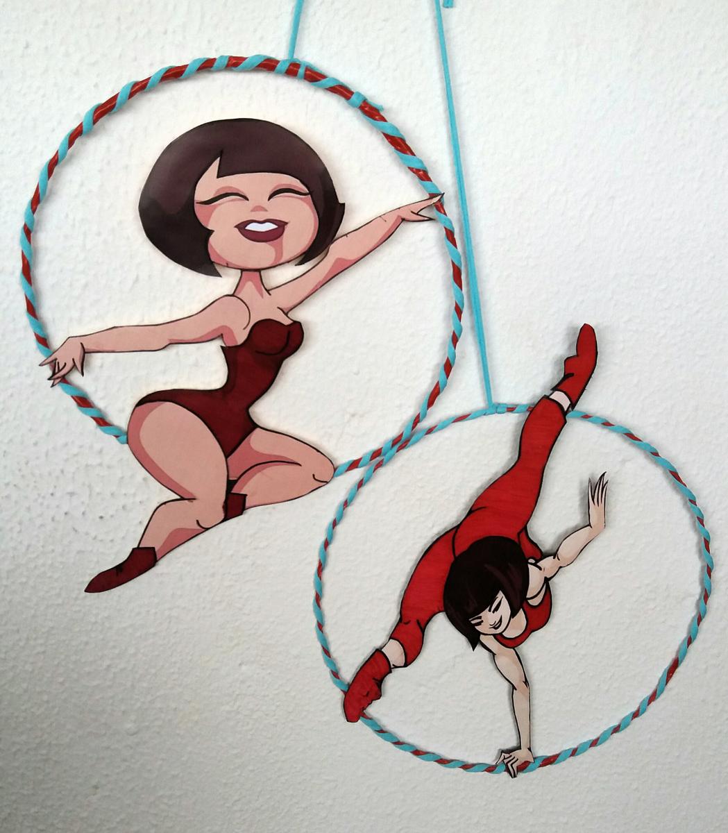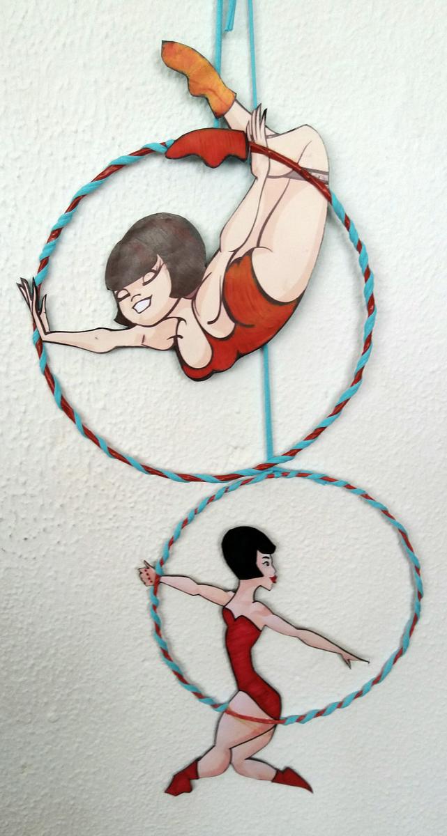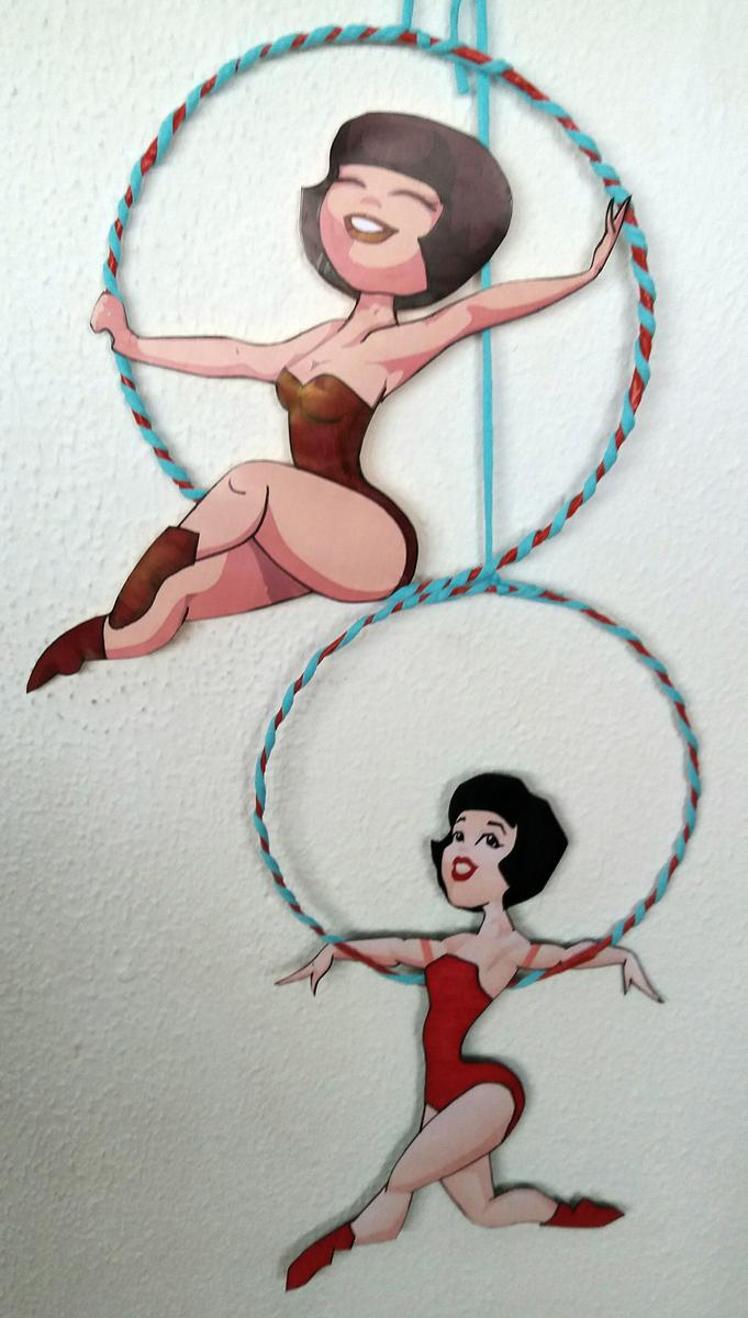 Encontré el diseño de la acróbata ideal y trás retocarla con diseño gráfico y manualmente, las coloque en unos aros de alambre forrados. El circo se basa en el rojo y todo iría unificado en ese color añadiéndole turquesa, el color elegido por la protagonista. Estas son las artistas.