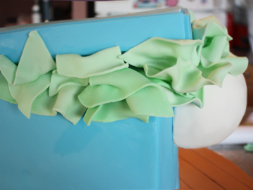 Comprobar y ver si la parte de la caja de regalo de la torta está lista para ser cubierto de fondant. Hielo una vez más si es necesario. Dejarlo en la nevera, mientras que el color de su pasta de azúcar. Estoy haciendo la luz azul de la caja, y de color verde claro para el papel de seda. Dejé que el aire de la pasta de azúcar un poco (la adición de geles de color puede hacer que sea pegajosa / mojado para trabajar), antes de empezar a usarla.