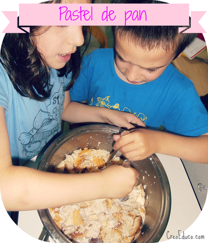 Ponemos en un cuenco el pan a remojo con la leche y lo vais removiendo con una cuchara hasta que el pan esté bien empapado. Esta parte la pueden hacer lo niños. Cuando este desecho el pan ponemos el azúcar y la canela y removemos. Bien a mano o dandole un meneín rápido con la batidora. Luego batimos los 3 huevos, los mezclamos y volvemos a remover bien con una cuchara. Por ultimo se echa la levadura y mezclamos todos los ingredientes. Vertemos la mezcla en un molde untado con mantequilla.
