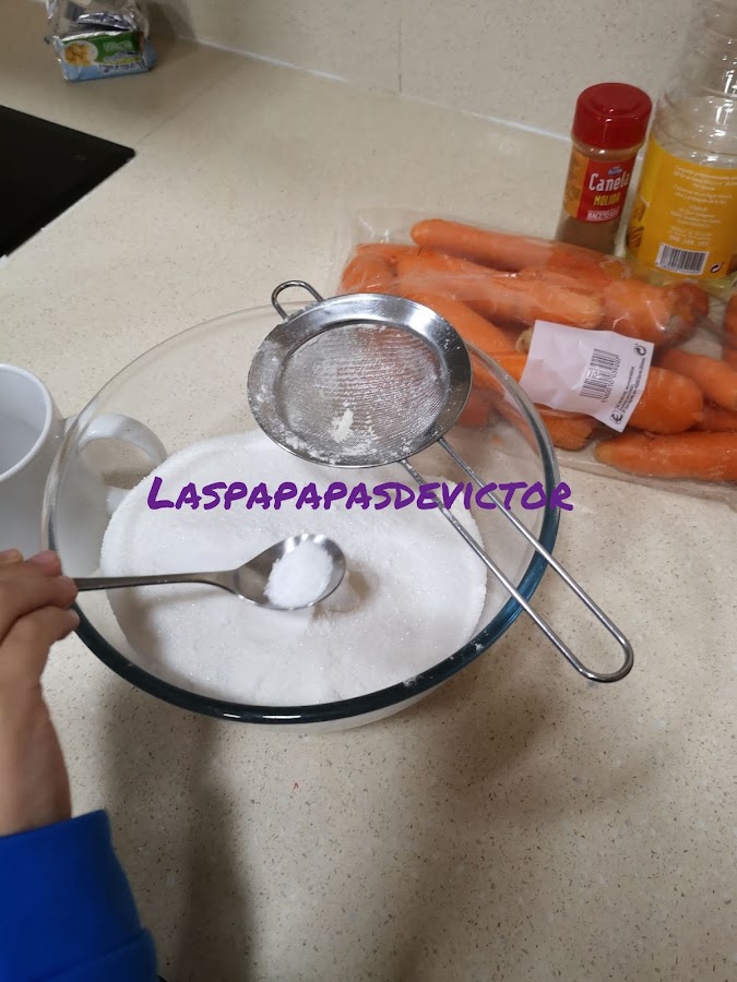 En un bol poner las zanahorias ralladas, la harina tamizada y el polvo de hornear