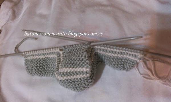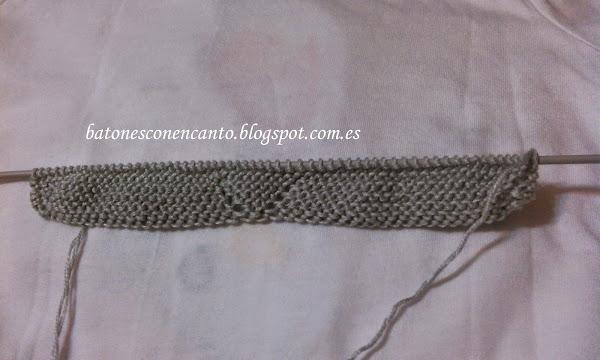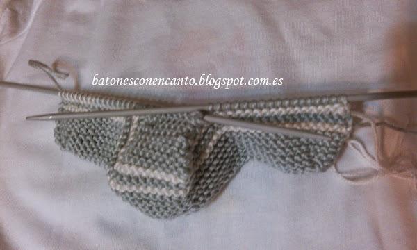 Dar la vuelta a las agujas y volver a repetir hasta que tengamos las 10 vueltas del empeine. Una vez hechas las 10 vueltas continuamos tejiendo los 15 puntos que quedan en la aguja.