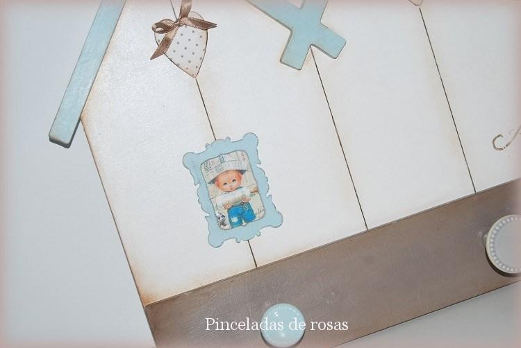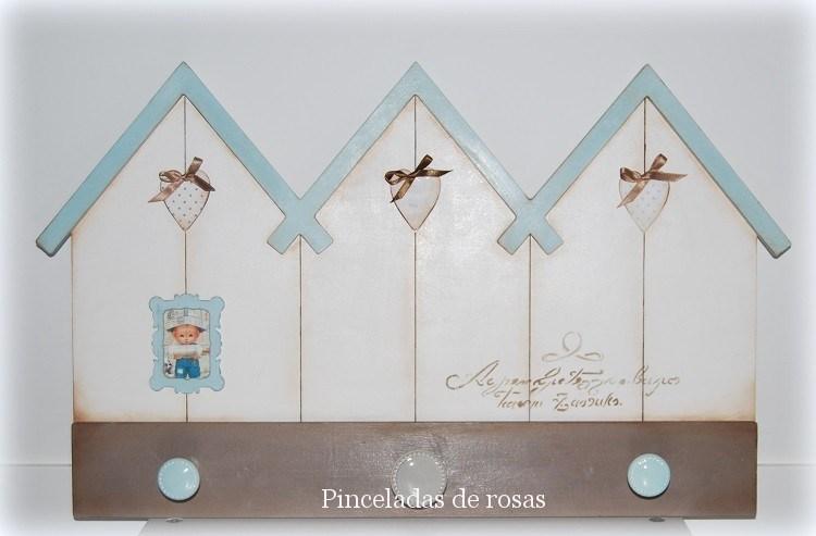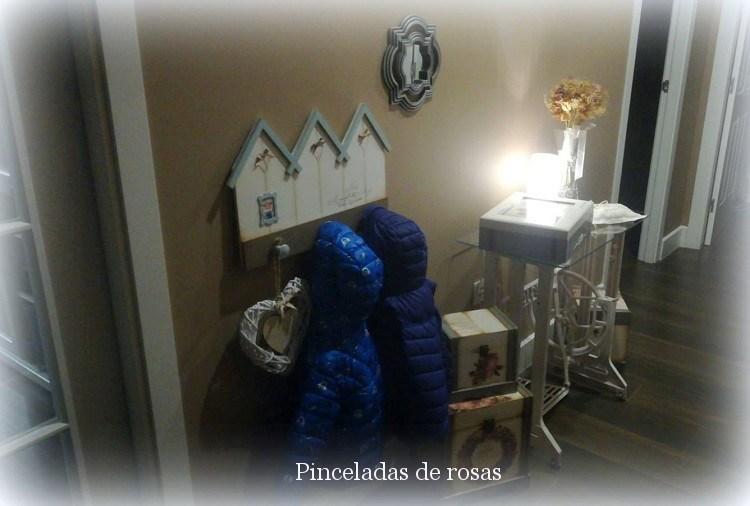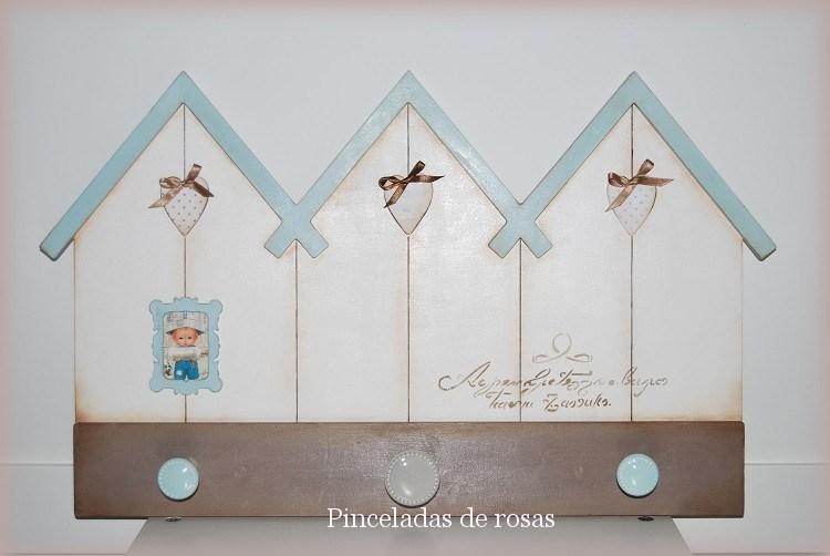 Este perchero es un soporte de madera, para la pintura realice un combinado de blanco-azul-marrón, con tonalidades pastel-suave y como terminación lleva cera, a mi gusto le da un acabado natural, ligeramente envejecido con ceras y pátinas