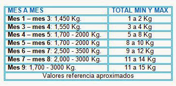 Pero si lo que quieres es saber cuánto es más o menos lo que vas a engordar mes a mes, puedes guiarte por la siguiente tabla: