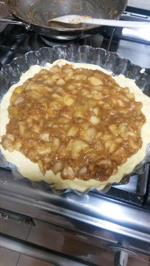 2. Para el relleno, cocinar ligeramente las láminas de manzana. Luego, mezclar con azúcar, canela, nuez moscada y mantequilla. Al final, echar harina de a pocos. Mezclar bien y dejar enfriar. *Secreto: cocinar a fuego lento, cuando se echa la harina subir a fuego medio.