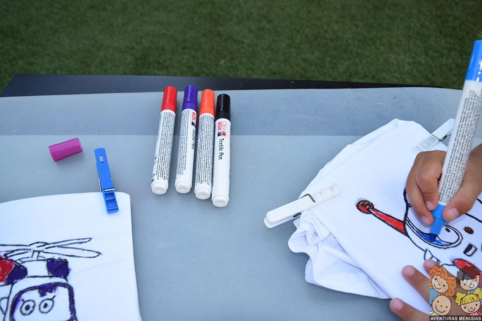 Preparamos cada camiseta con un cartón debajo del lado donde estaba el dibujo, para evitar que la pintura pasara a la parte de atrás de la camiseta. Además, con pinzas, sujetamos al cartón el resto de camiseta, de manera que solo quedaba visible el dibujo y resultaba muy manejable para ellos.