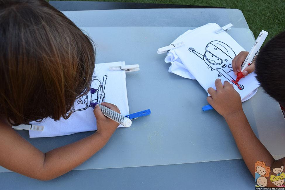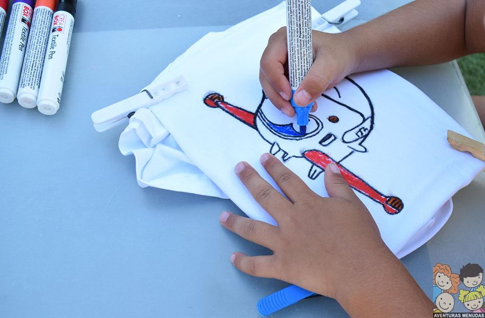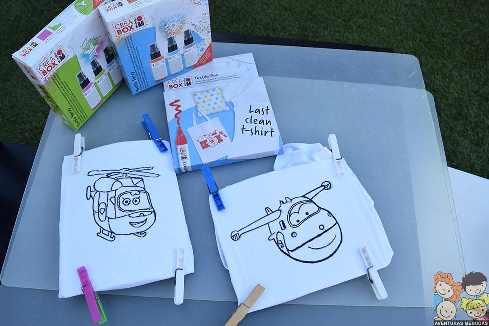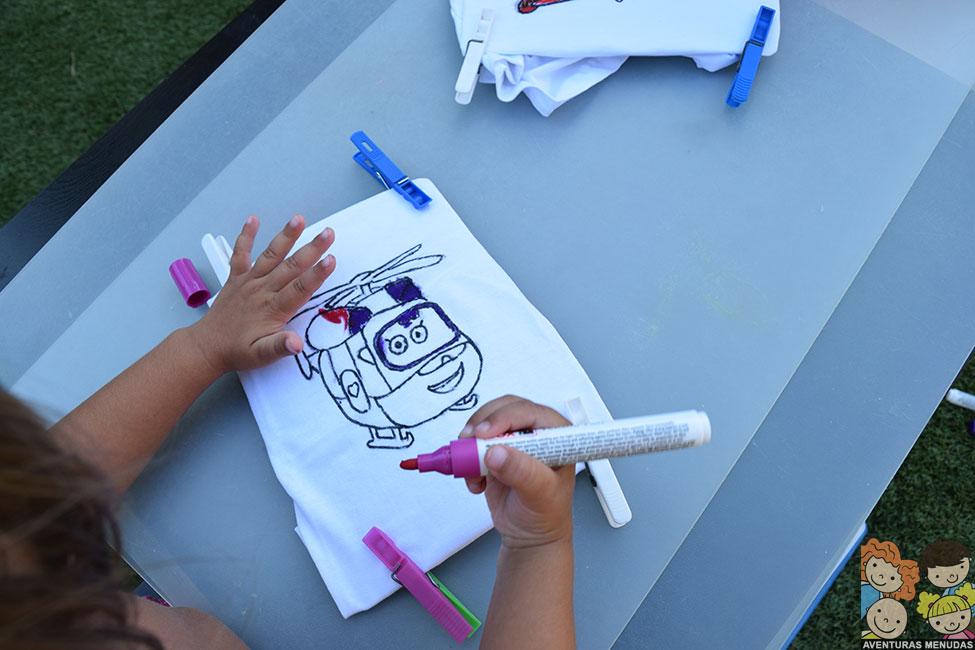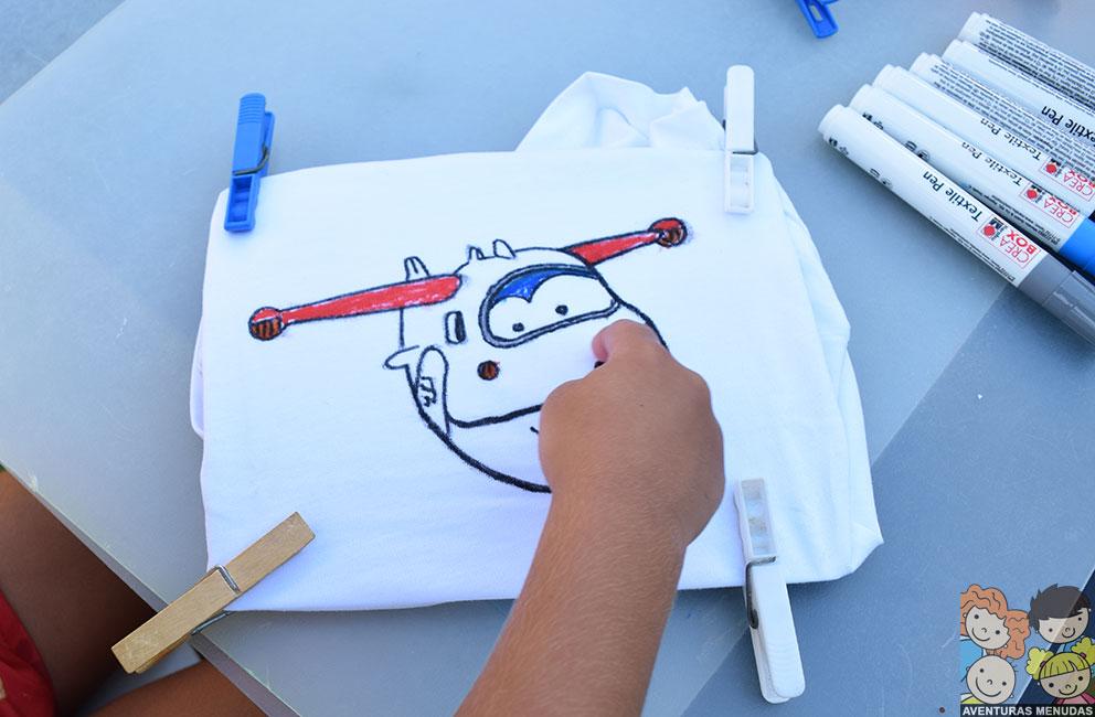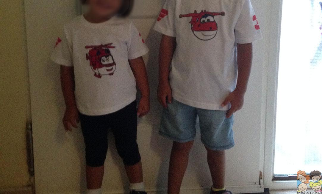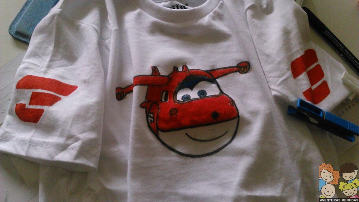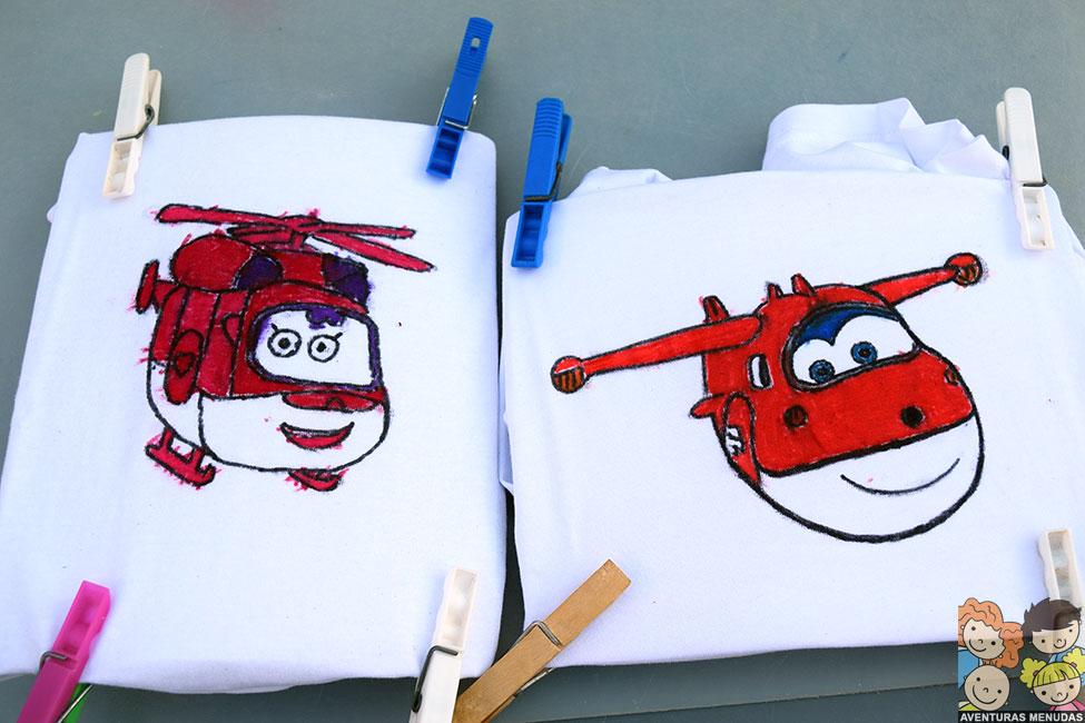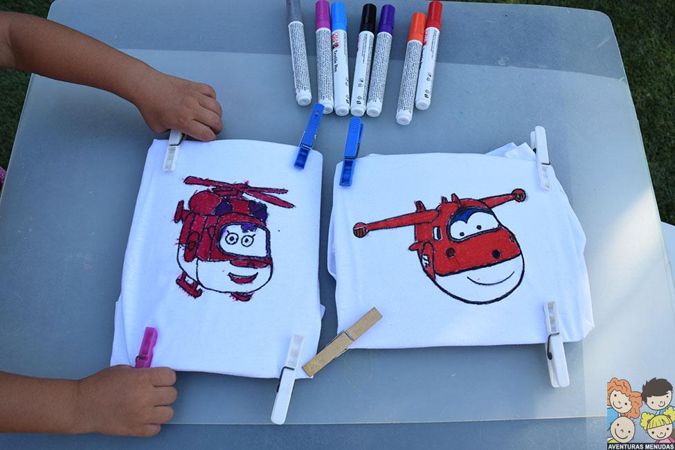 En el caso de las camisetas, decidimos pedir a los peques que eligieran qué querían dibujar en sus camisetas. Podía ser estilo libre (dibujando lo que quisieran) o que les hiciéramos el contorno de algo que les gustaría llevar en su camiseta y lo pintaran ellos. Eligieron esto último. El tema, pues los dibujos de moda Super Wings…. jajajajaa.