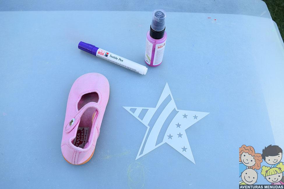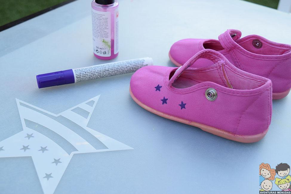 Después de pintar toda la zapatilla con el spray rosa, dejé secar un par de horas y utilicé el rotulador morado para decorarla, usando para ello una de las plantillas.