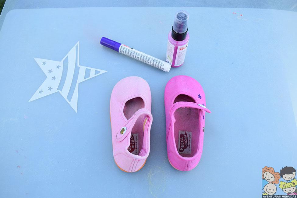 Por otro lado, también decidí utilizar los sprays y plantillas (trae algunas el pack de sprays) para restaurar unas zapatillas para la peque, ideales para el final del verano y principio de otoño.