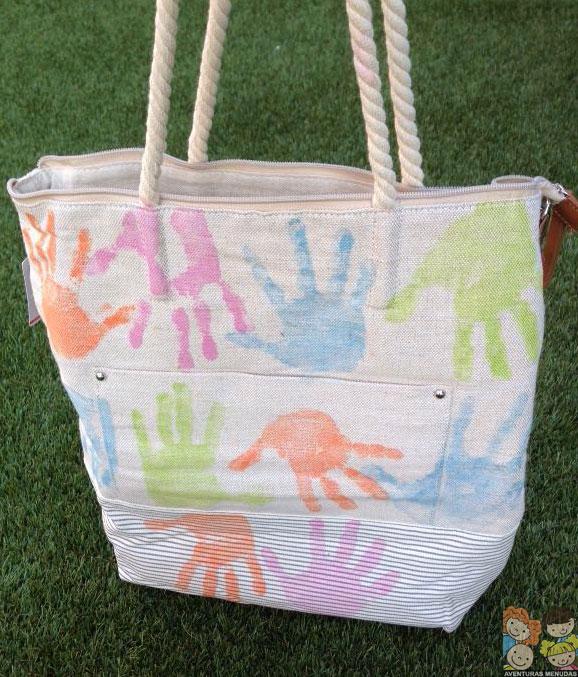 Los sprays los utilizamos ya al acabar el cole, para hacer el regalo de la profe de mi peque mayor. Usando el spray, fuimos pintando las manos de los peques de la clase y decoramos un bolso de verano con ellas. Nos quedó chulísimo y no solo eso, sino que completamente original y diferente.