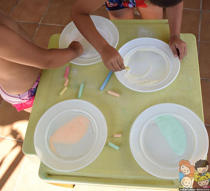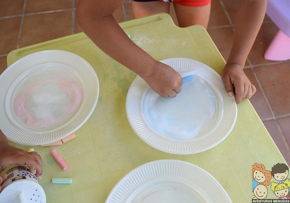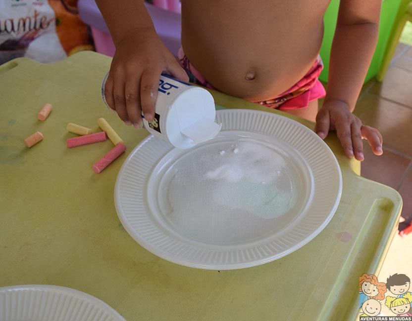 Usando tizas de colores, vamos rascando la tiza sobre el bicarbonato, para que vaya soltando polvo del color elegido, que se irá mezclando con el bicarbonato.