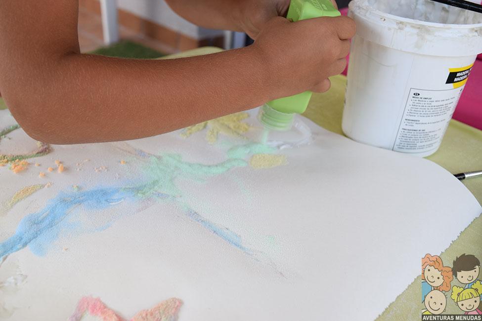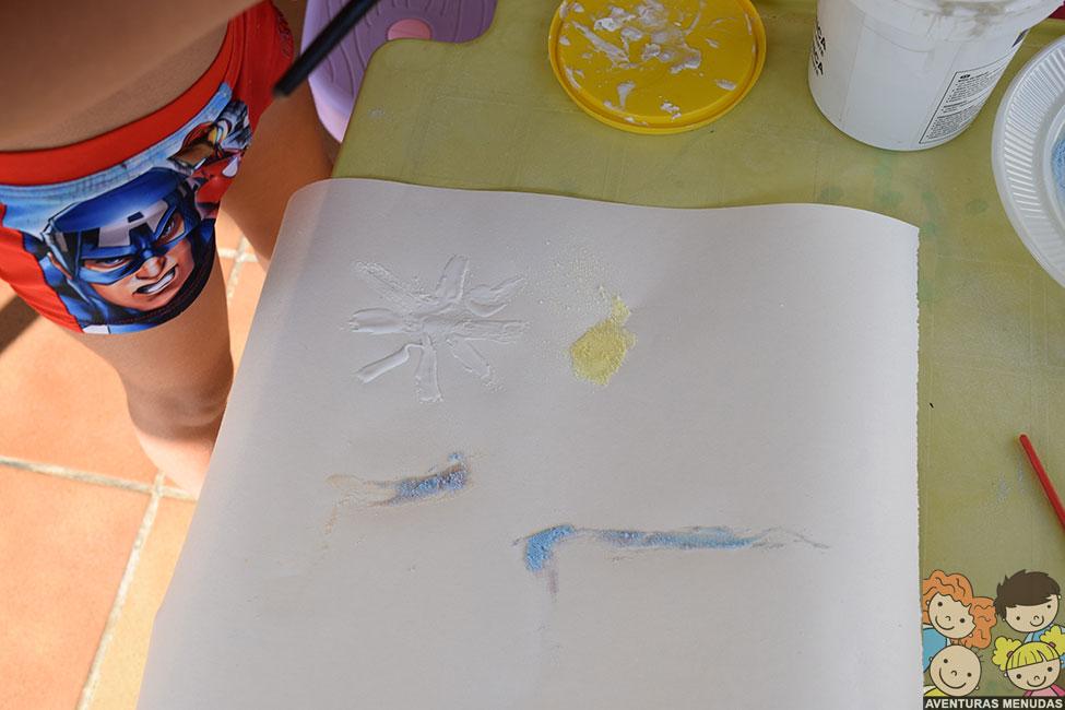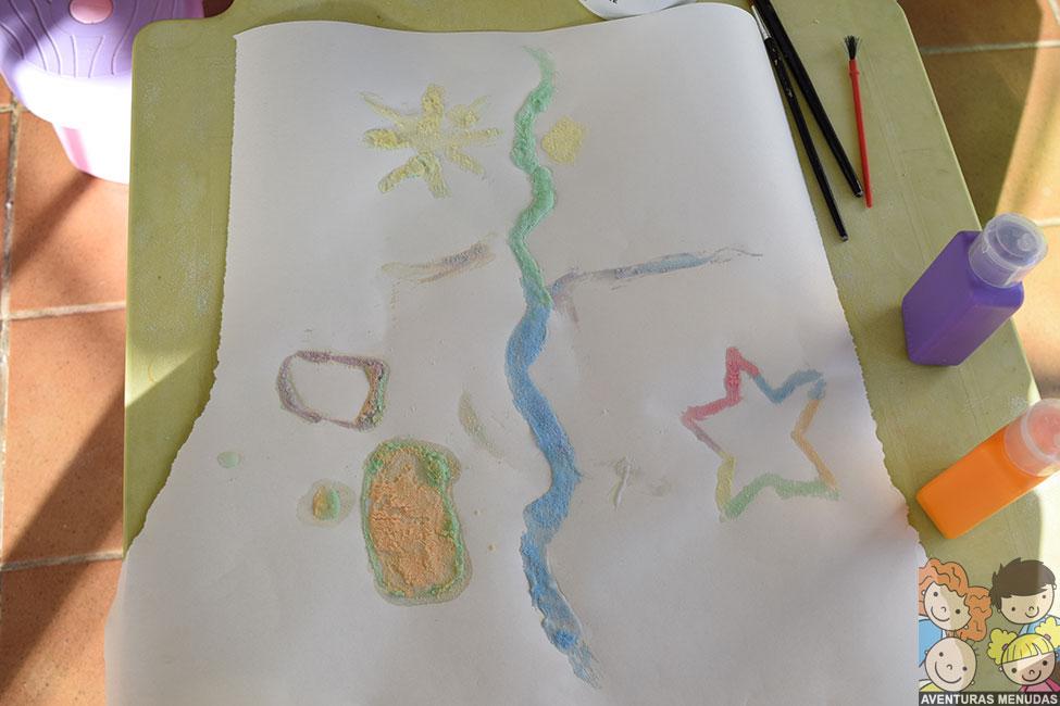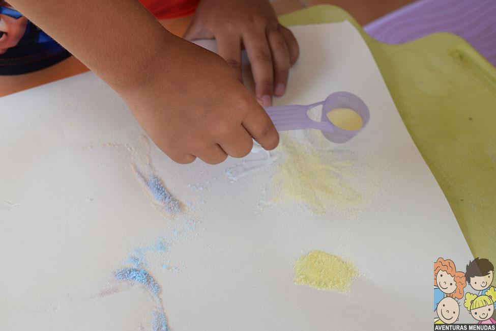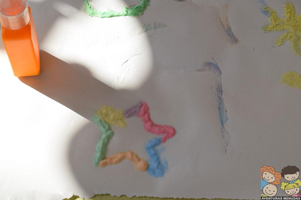 Después usamos el dosificador de los botes que contienen el bicarbonato de colores o bien alguna cuchara con agujeritos (por ejemplo, las que se usan para la leche en polvo o los cereales infantiles), para ir echando bicarbonato con el color deseado sobre la cola o el pegamento. Pueden usar un poco el dedo para presionar y que se fije el color al pegamento, de manera que luego, moviendo la hoja, los restos sueltos de bicarbonato se podrán recoger fácilmente.