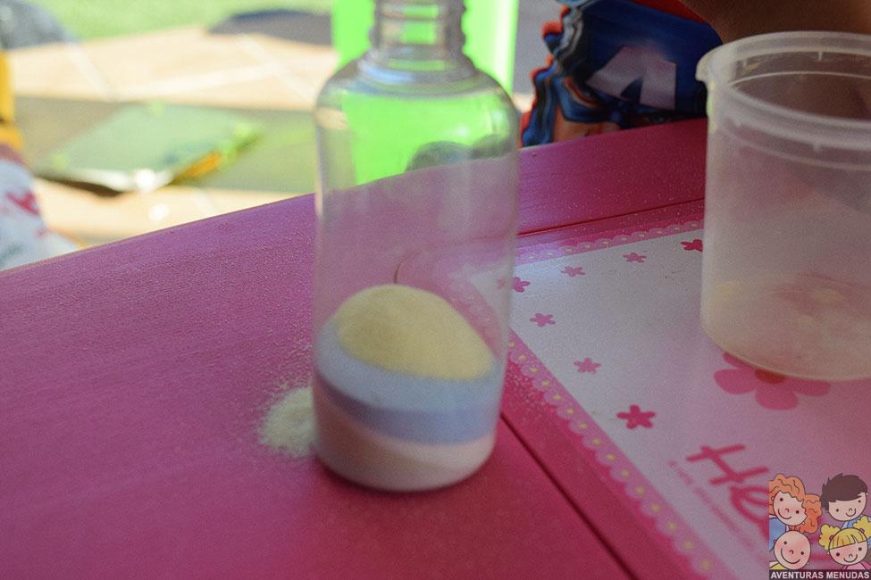 Con esos restos de bicarbonato, podéis hacer botecitos para decorar de colores, o juntar todos los colores en un solo bote y mezclar para ver el color resultante de la mezcla. Ese bicarbonato podrá ser usado de nuevo para pintar en el color que haya salido resultante.