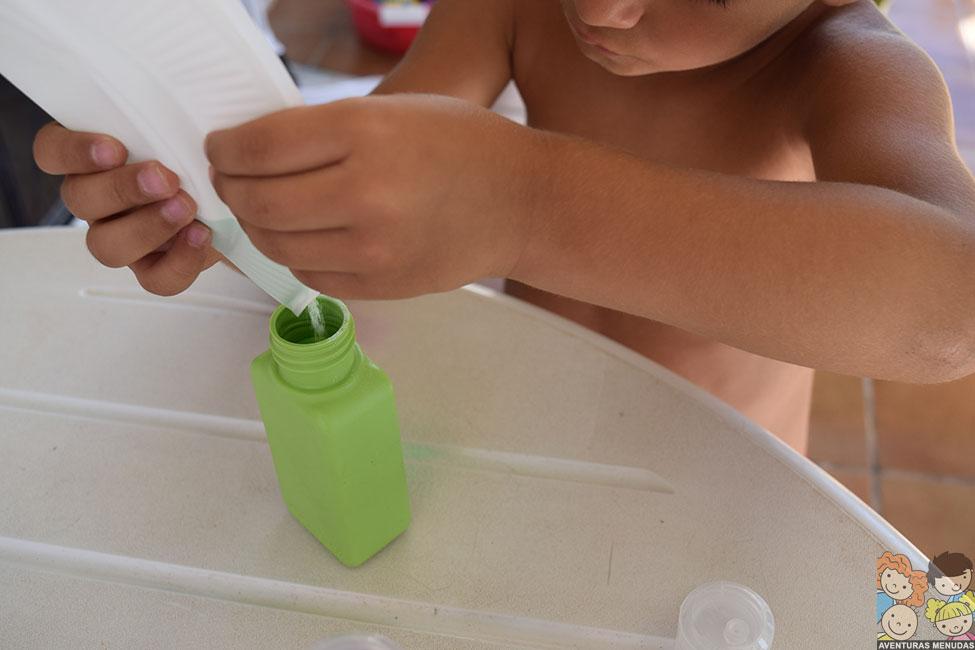 Cuando tengamos varios platos con diferentes colores, los doblamos por la mitad a modo de embudo y metemos el bicarbonato de cada color en recipientes individuales. Cada recipiente contendrá un color. Nosotros hemos usado unos recipientes que vienen con tapón y dosificador, de Ikea, que se supone que son botes para llevar los jabones, champus y demás cosas de aseo personal en los viajes. Como solo teníamos 4 colores, el resto de colores, los metimos en vasitos individuales.