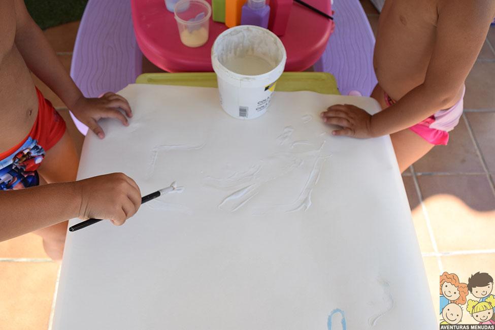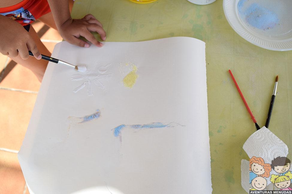 Con un pincel bastante gordo, pintamos el papel con cola blanca haciendo dibujos libres. O bien, con pegamento infantil blanco o transparente, damos forma a los dibujos con el propio dosificador del pegamento.