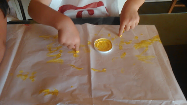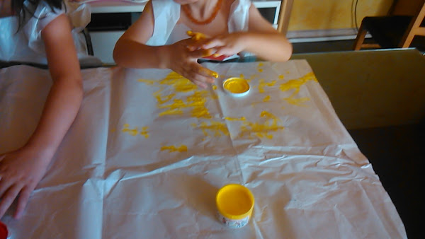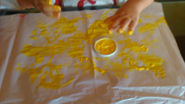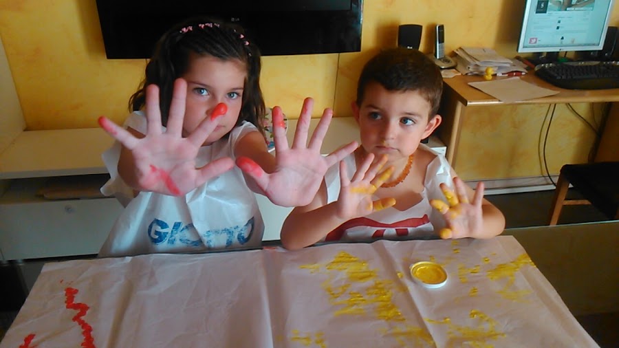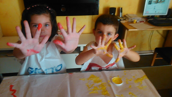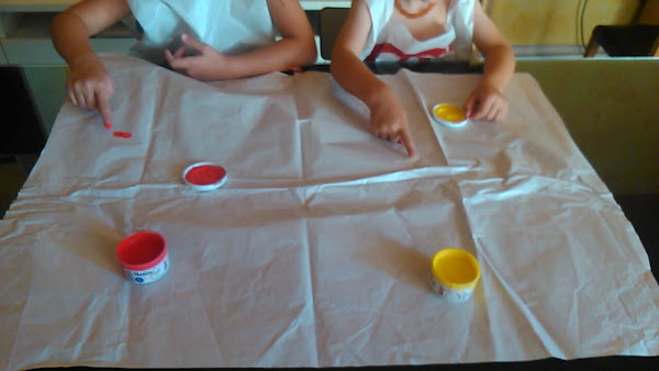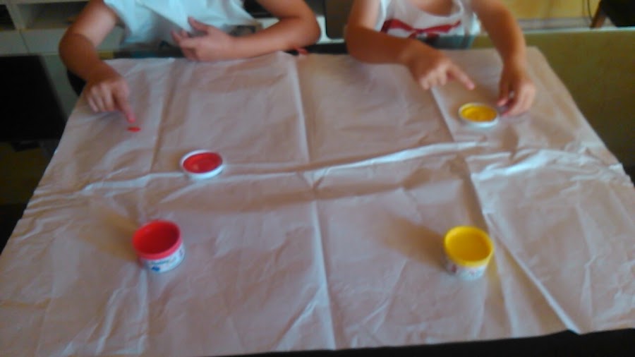 En mi caso los peques ya saben los colores así que saqué un color diferente para cada uno, y no se trataba ya de aprender los colores sino de que experimentaran la sensación de pintar con los dedos.