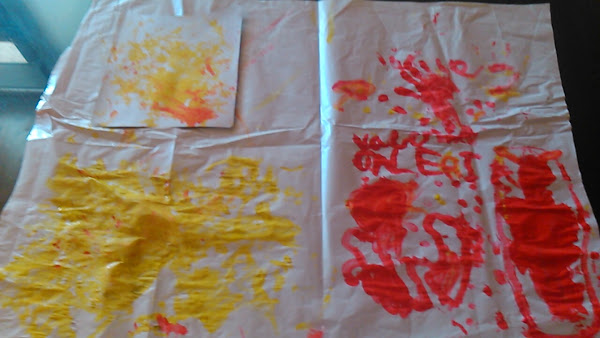 Llegados a este punto mis peques tenían las manos tan llenas de pintura que tuvimos que recurrir a las toallitas para poder limpiarles un poquito, porque la pintura empezaba a esparcirse por la mesa, ya que ellos no siempre miran donde se apoyan (mas bien nunca lo hacen, sobre todo el peque).